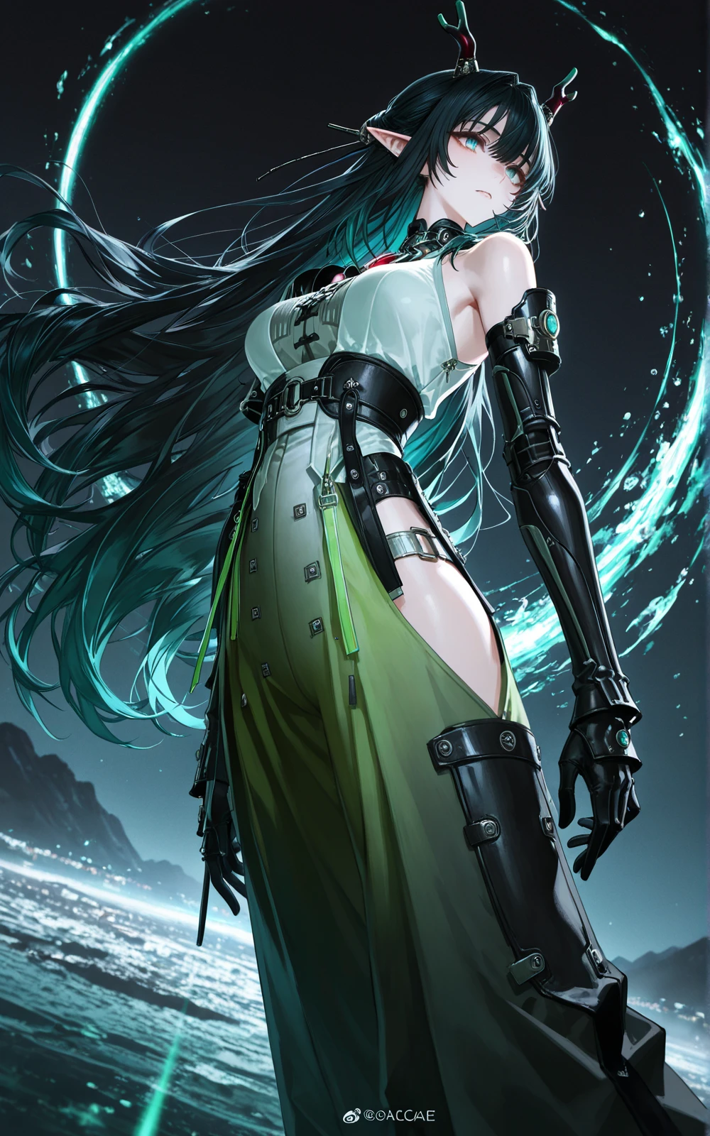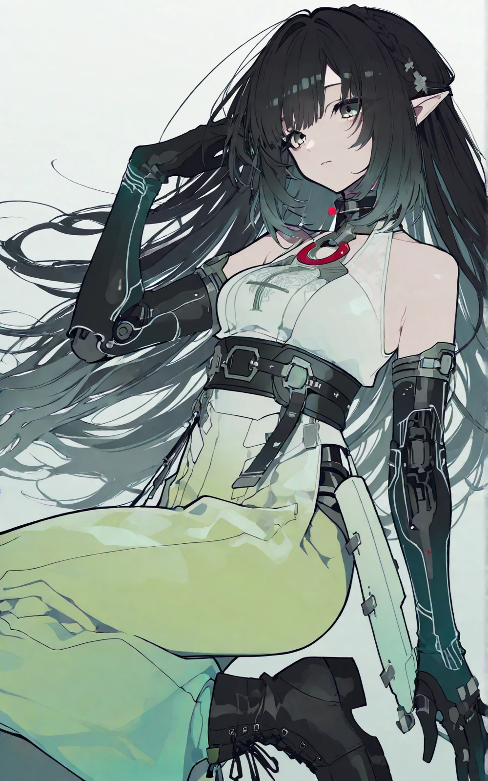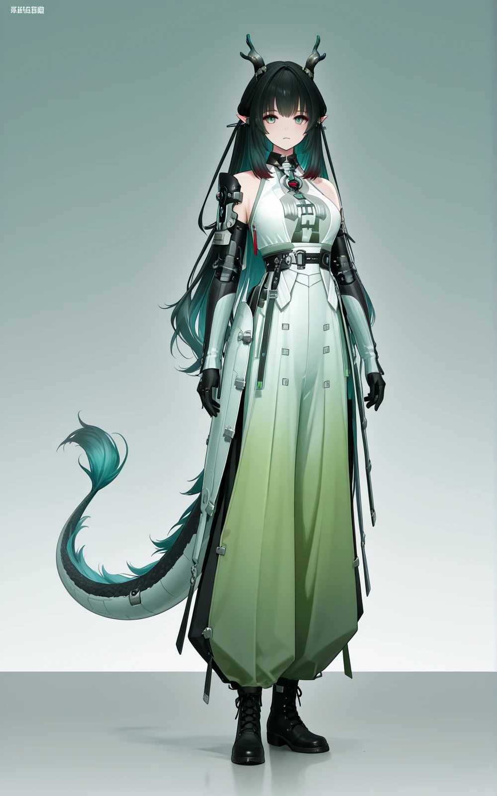 long black hair (turquoise gradient),green eyes,elf ears,white-green gradient tech-style sleeveless top,high waist belt,wide-leg pants,black mechanical arm armor,black gloves,black short boots,metal buckles,red decorative details,dragon girl,