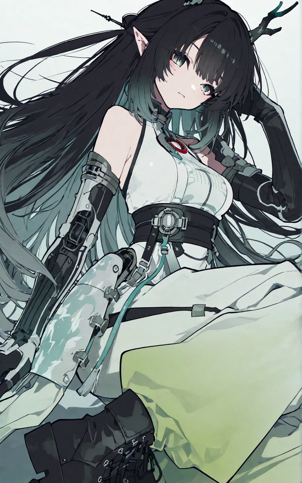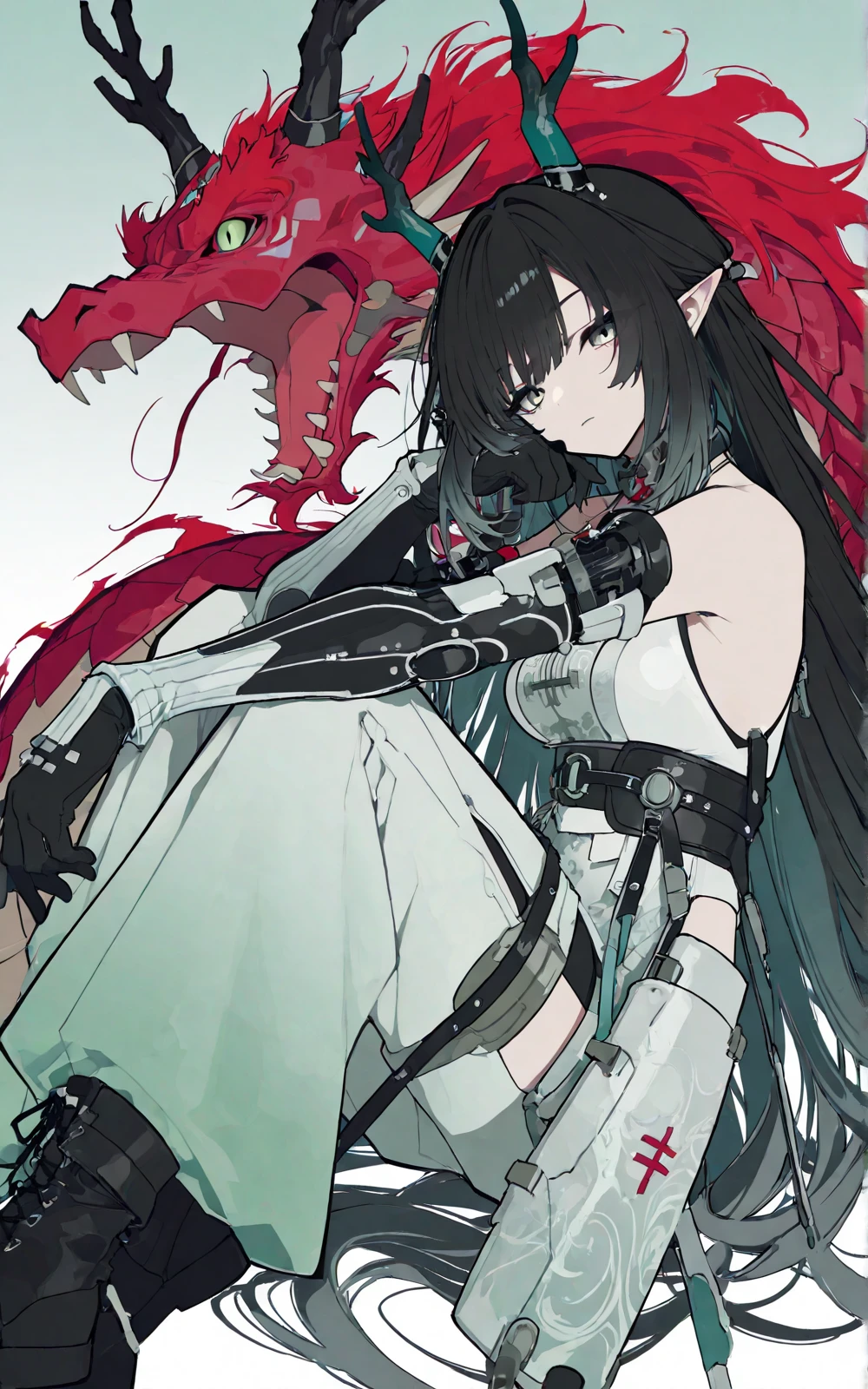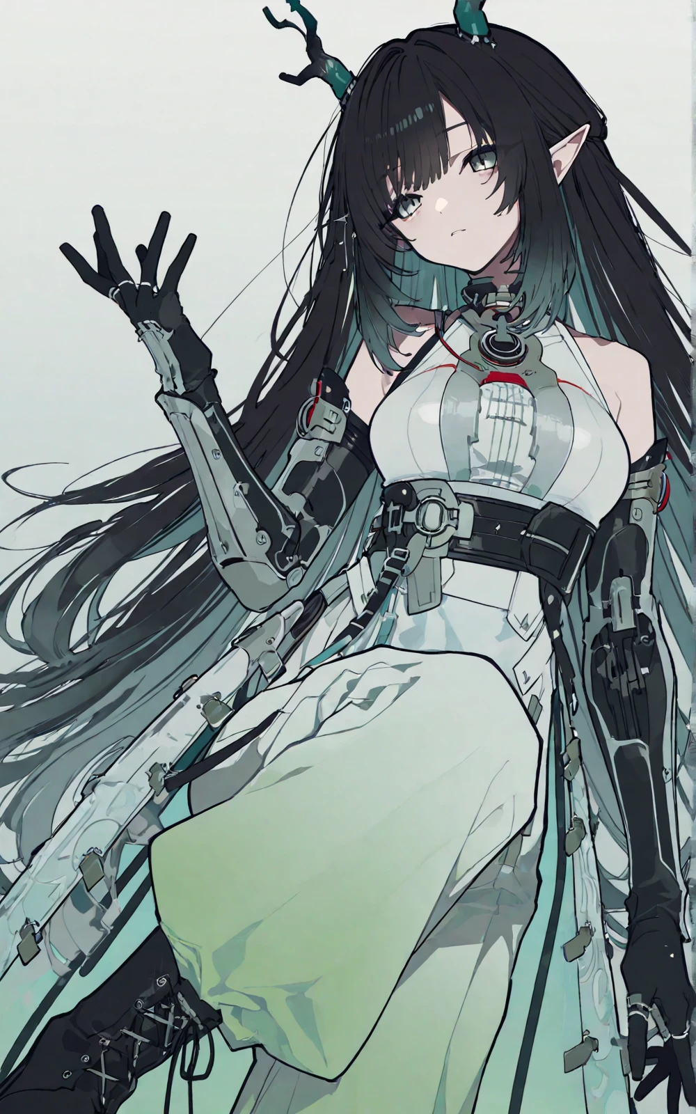 long black hair (turquoise gradient),green eyes,elf ears,white-green gradient tech-style sleeveless top,high waist belt,wide-leg pants,black mechanical arm armor,black gloves,black short boots,metal buckles,red decorative details,dragon girl,