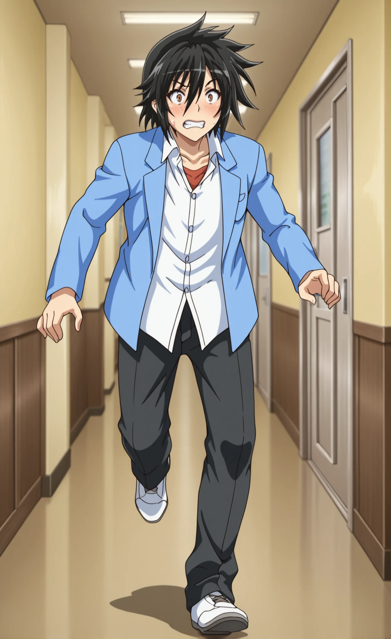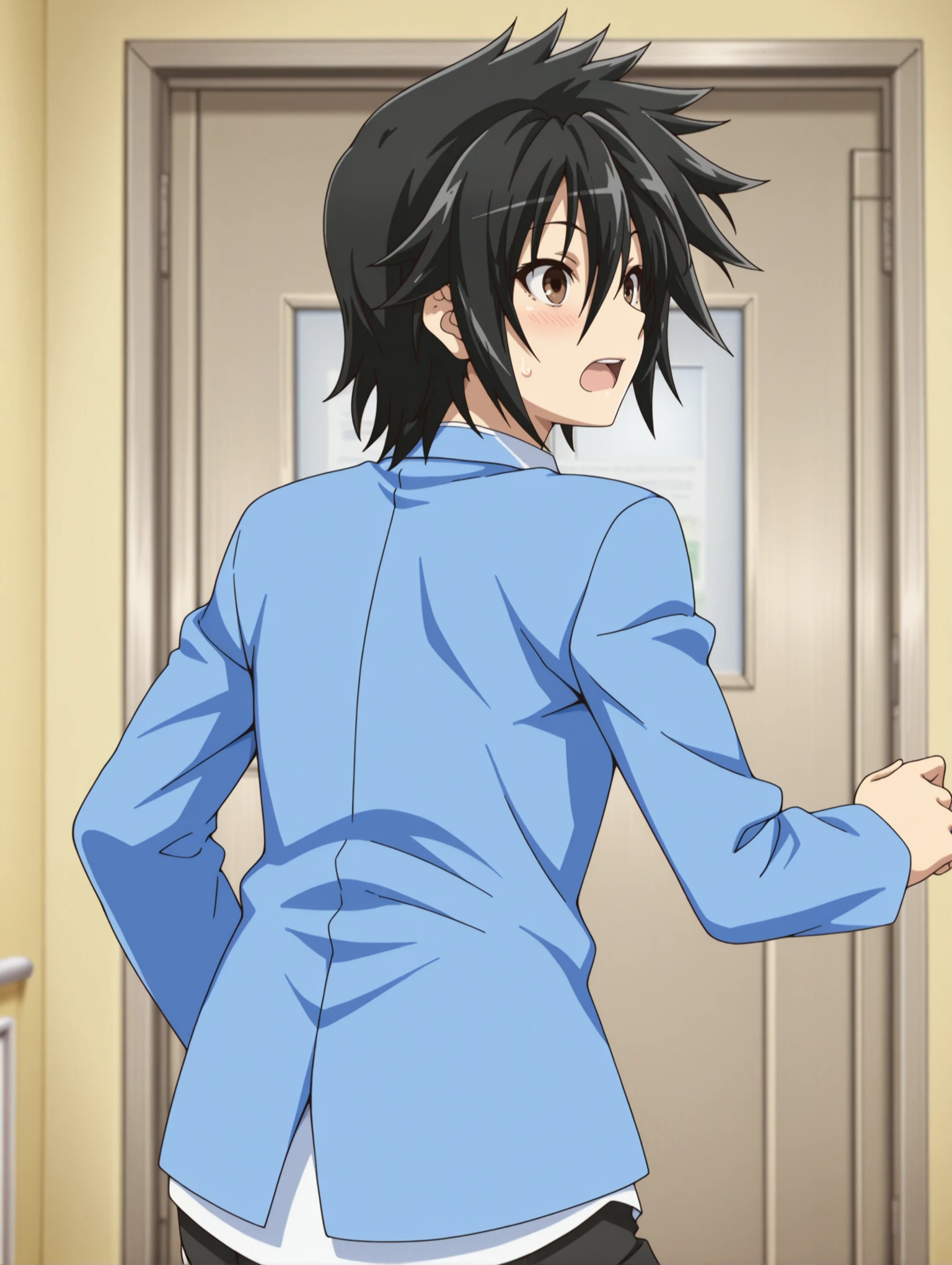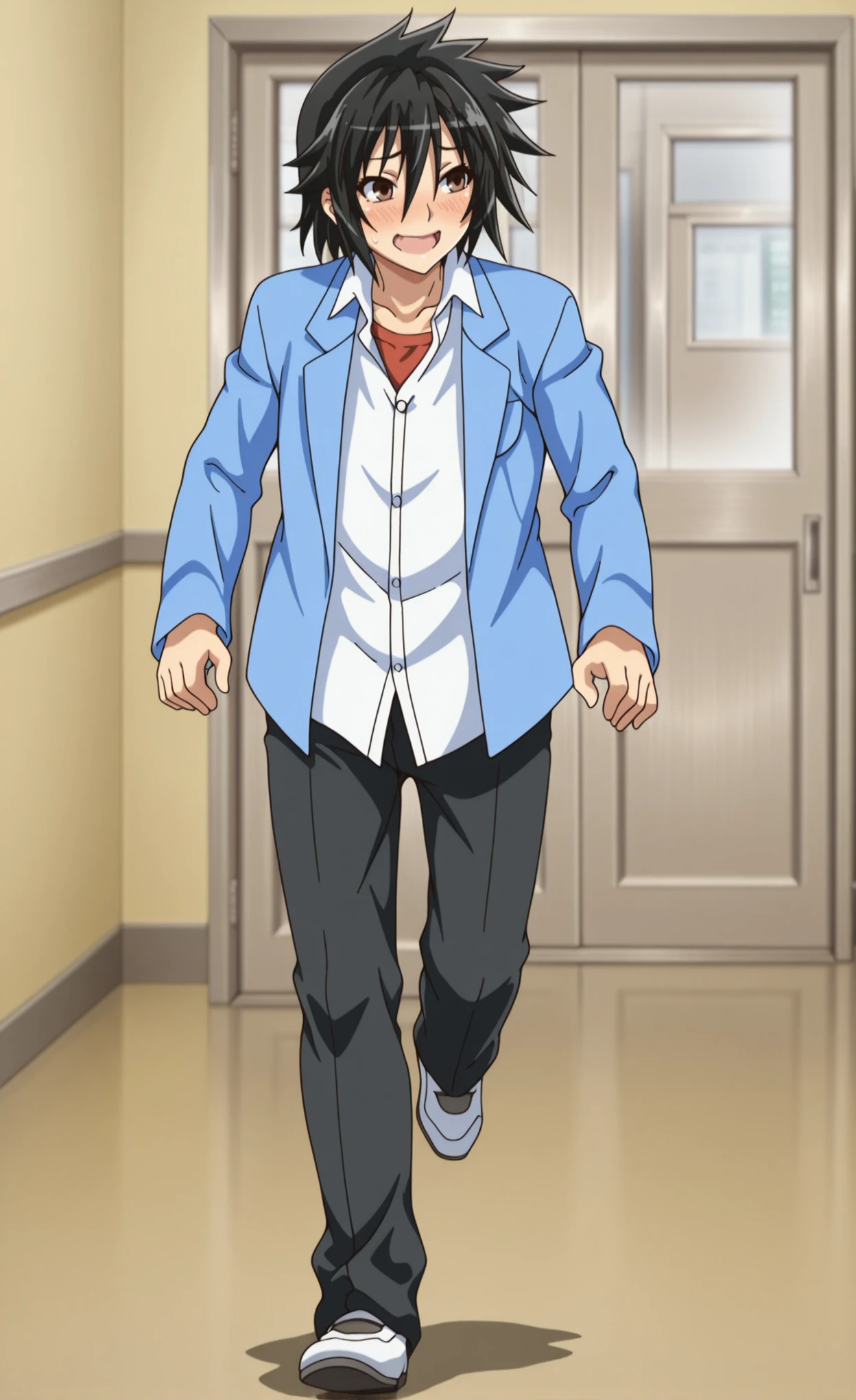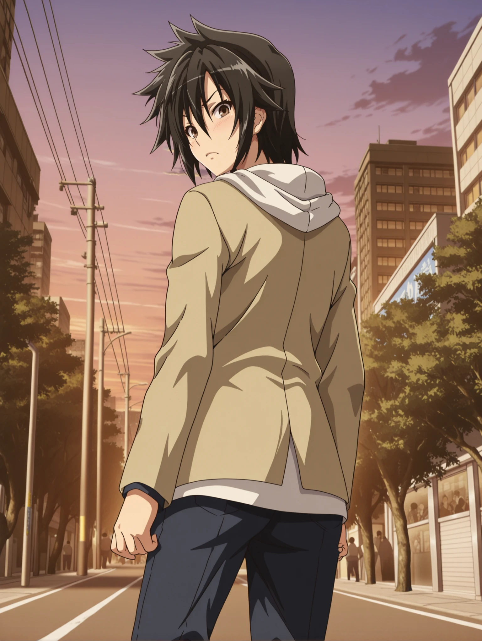 komaba Haruki, hair between eyes, medium hair, black hair, brown eyes, beige jacket, black shirt, necklace, pants