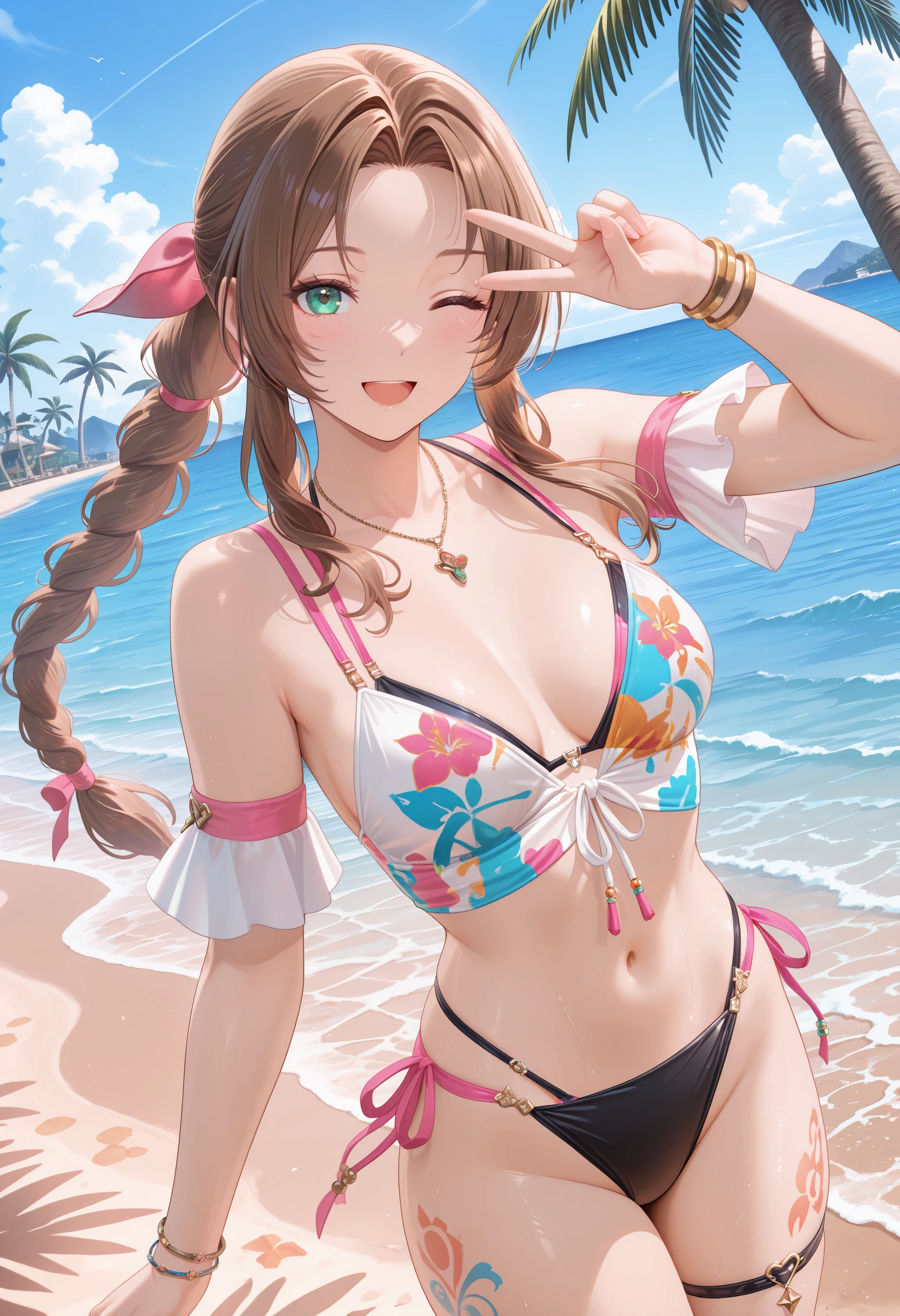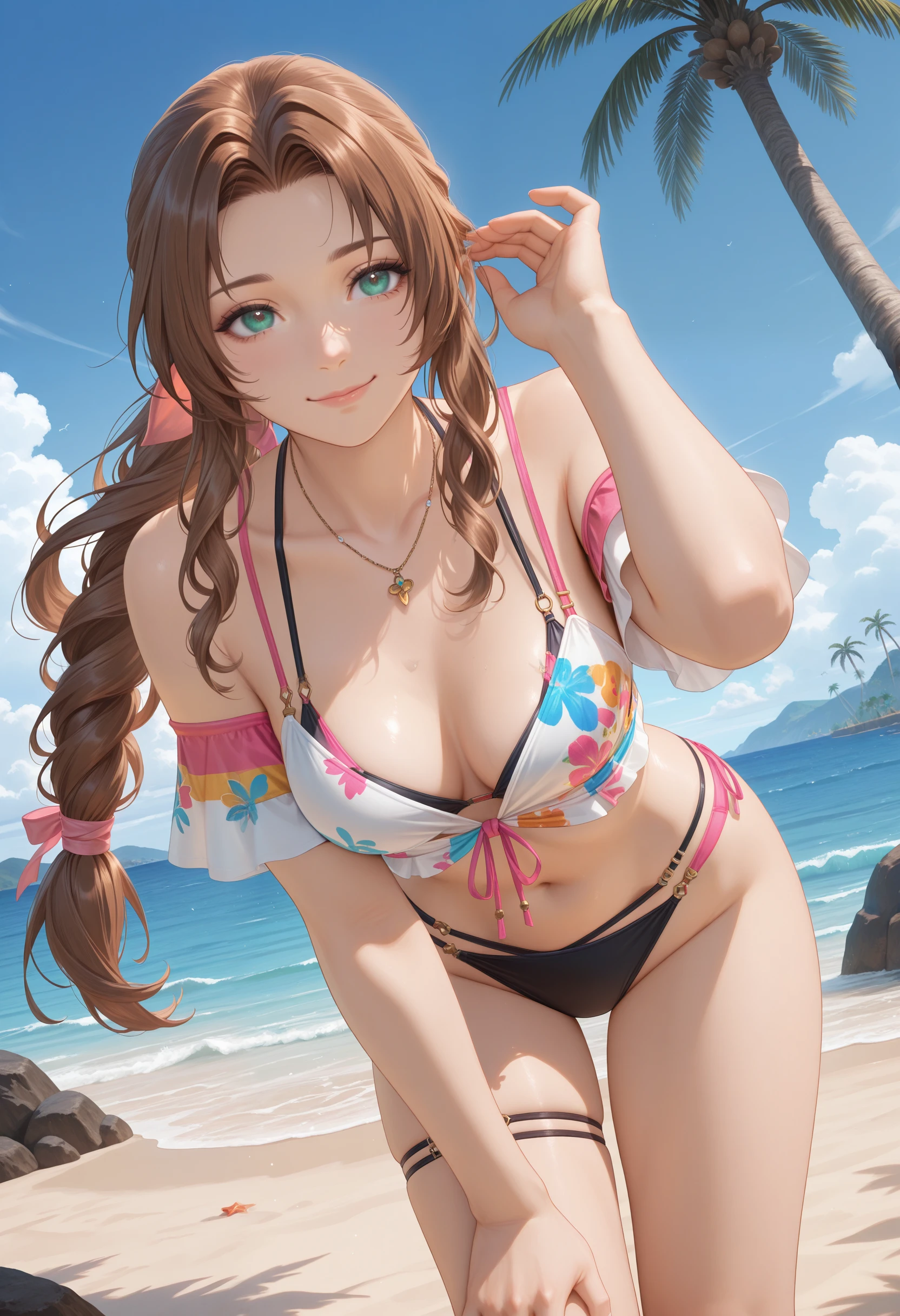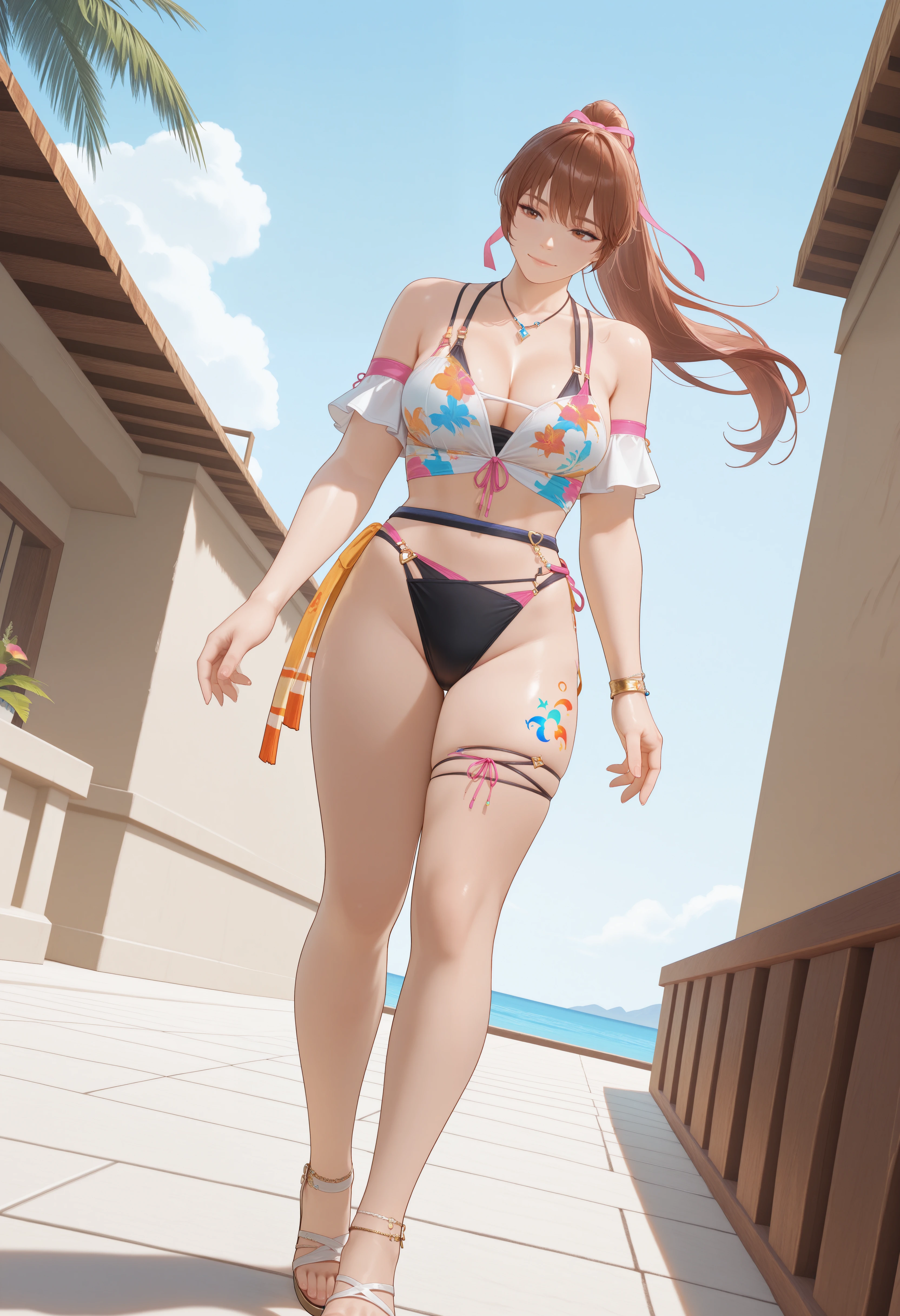 基本プロンプト:"SummerEncore_doaxvv,necklace,jewelry,black bikini,layered bikini,underwear,colorful tropical print crop top,detached sleeves,white short sleeves,pink ribbon-tied front,gold accessories,thigh strap,thigh tattoo,strappy heels".