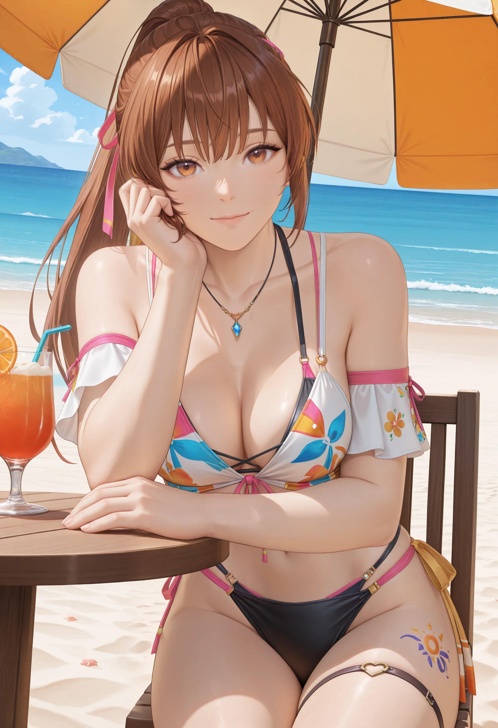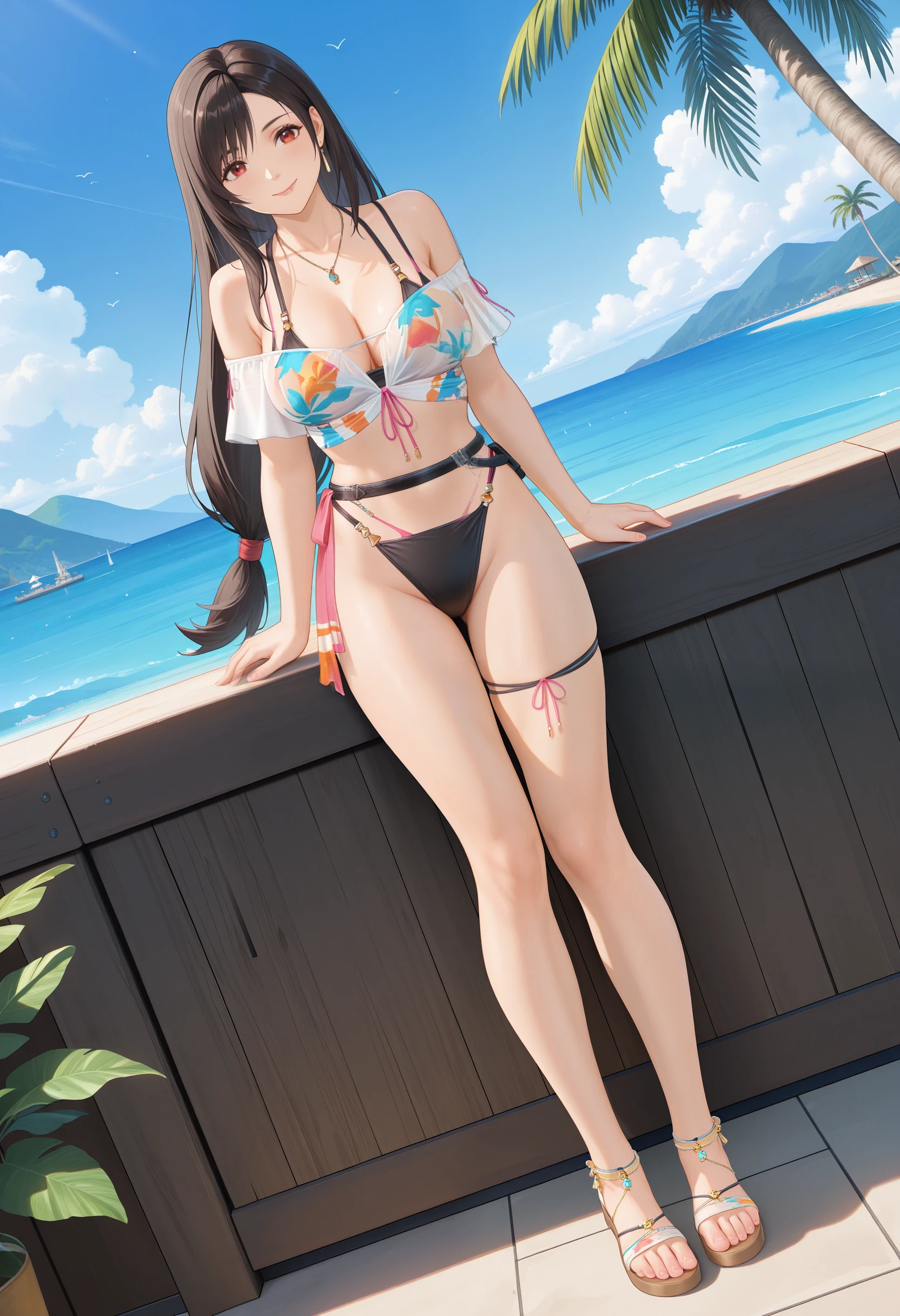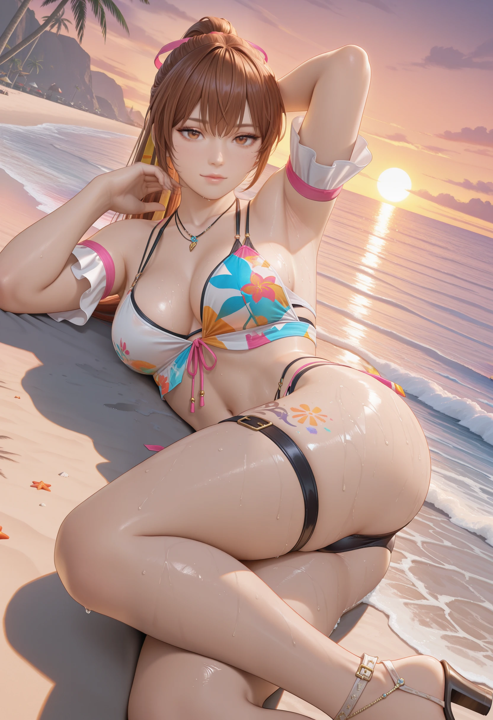 基本プロンプト:"SummerEncore_doaxvv,necklace,jewelry,black bikini,layered bikini,underwear,colorful tropical print crop top,detached sleeves,white short sleeves,pink ribbon-tied front,gold accessories,thigh strap,thigh tattoo,strappy heels".