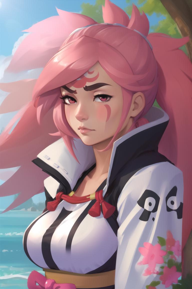 Add pink hair and pink eyes if necessary. She can be generated with both arms, nothing I can do about that.