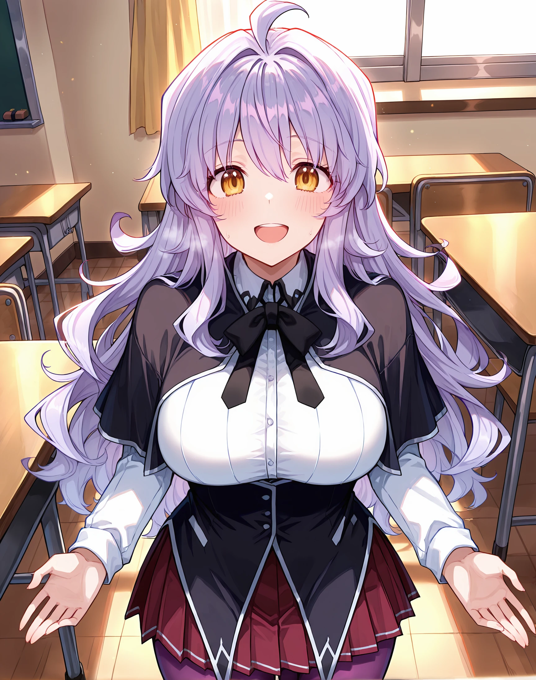 outfit_1, school uniform, white shirt, pleated skirt, red skirt, black bow, black capelet, purple pantyhose, long sleeves