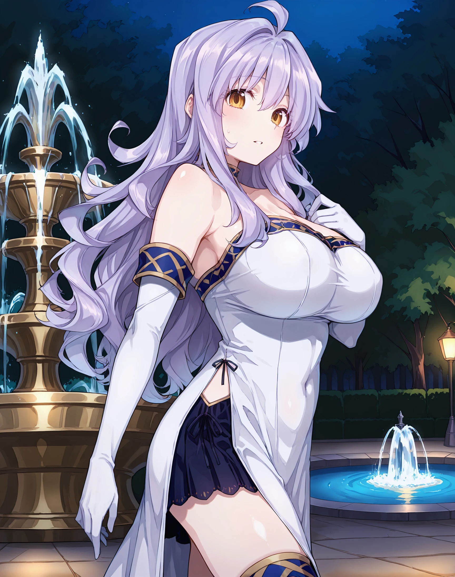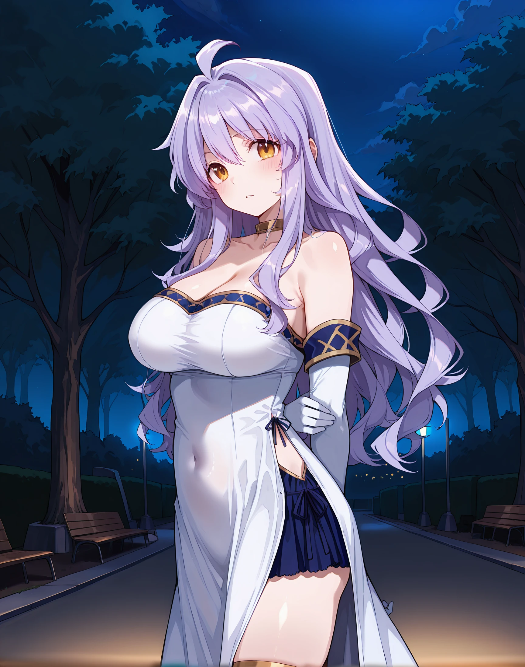 outfit_2, elbow gloves, white dress, black thighhighs, white gloves, ???? shoulders, choker, collar, side slit, golden accents, side ribbon, mini skirt,
