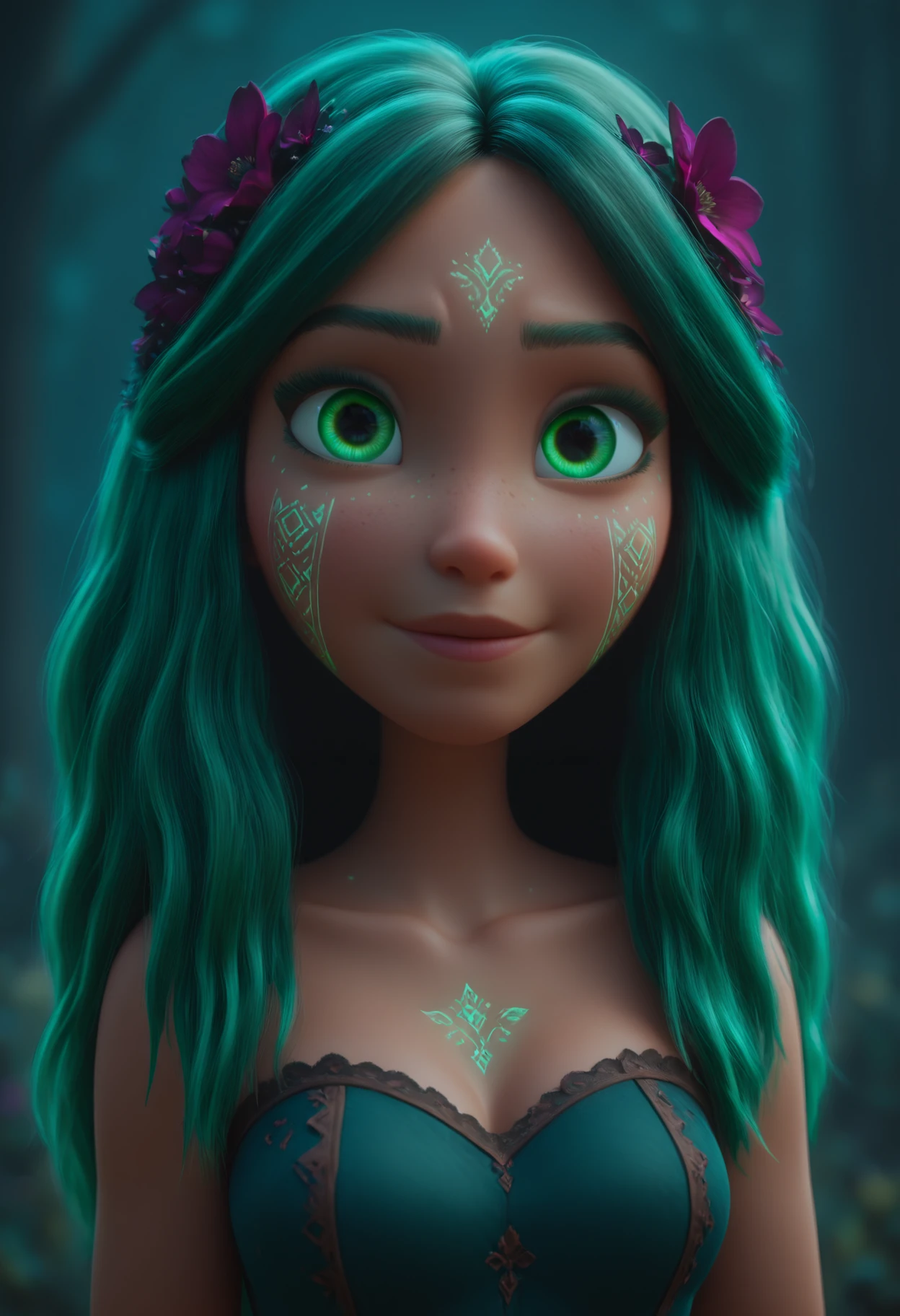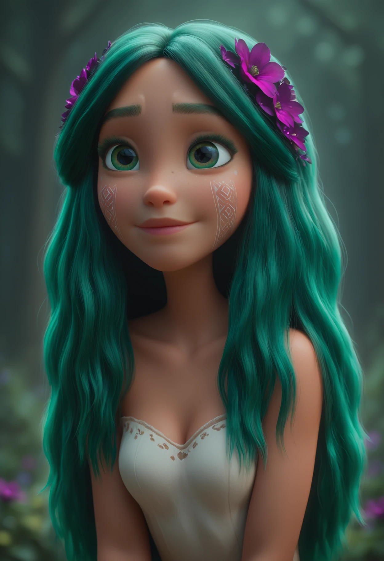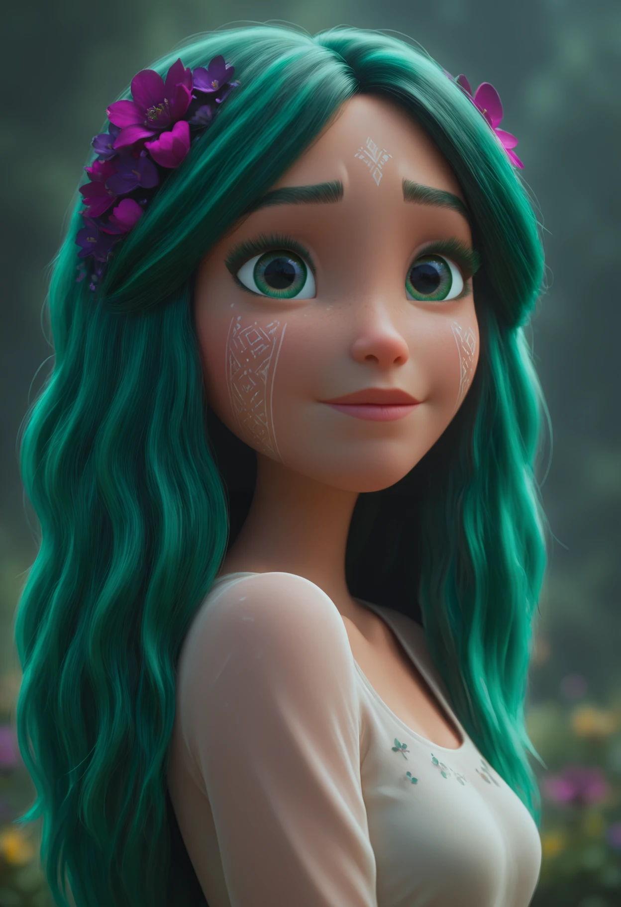 M4vk4, green eyes, green hair, long hair, flower hair ornament, white face markings
