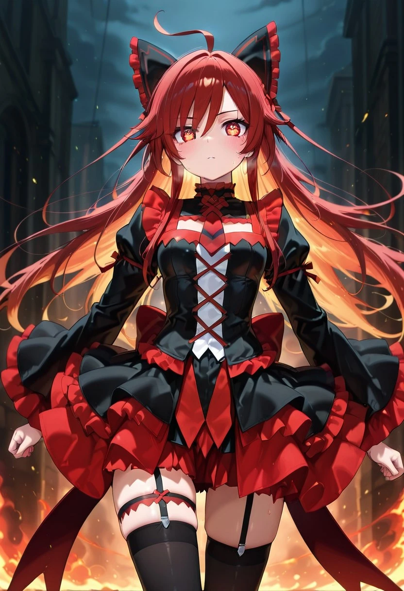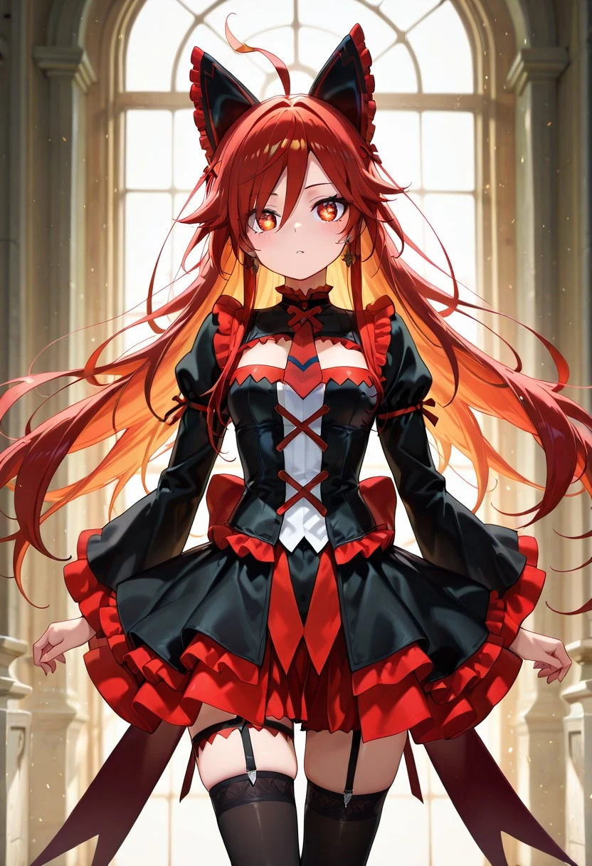 rrymrcryclthng, black and red frilled dress, short puff sleeves, red ribbon bow on chest, corset with red lace-up front, layered ruffled skirt, black thighhighs with garter straps, long twin tails with red hair bows