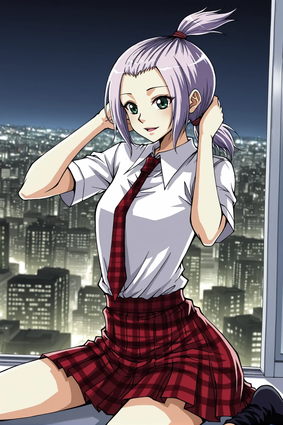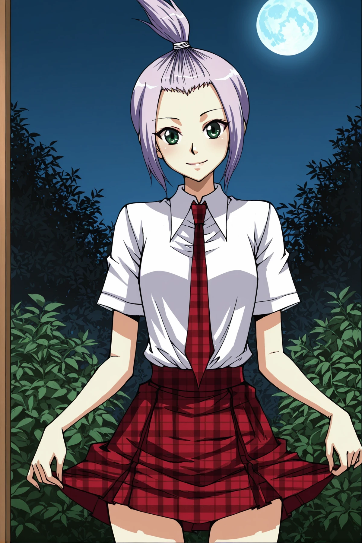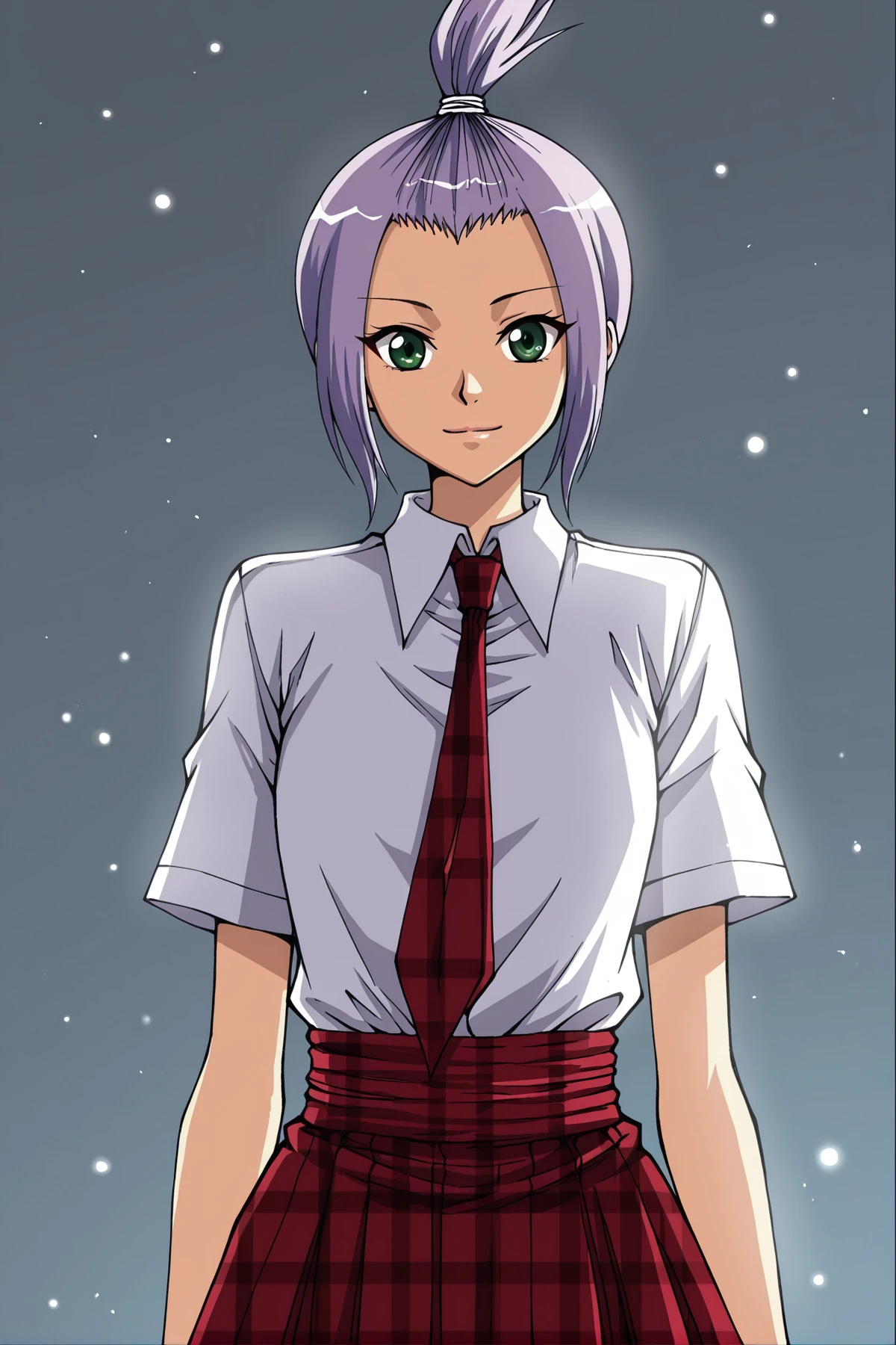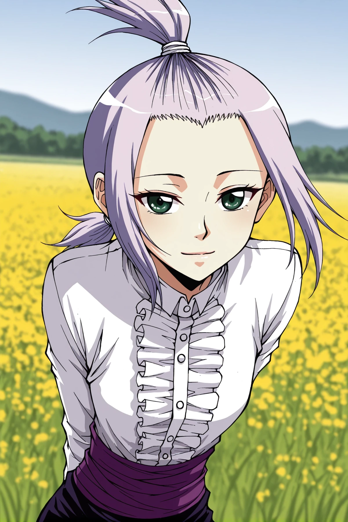 Xixi, 1girl, solo, green eyes, light purple hair, short hair, tied up bangs, topknot, hair tied up, sidelocks, low ponytail,