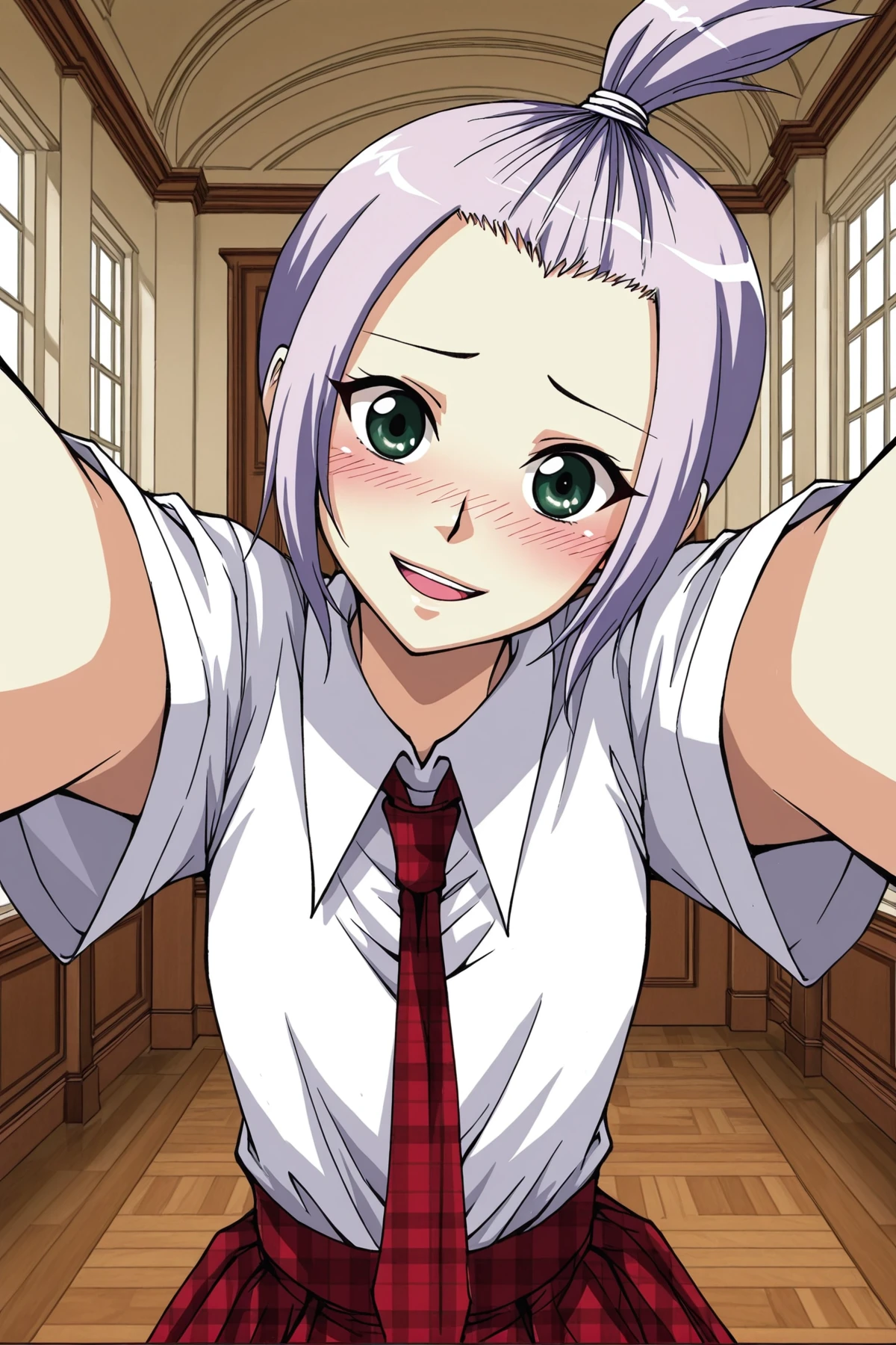 Xixi_outfit2, white shirt, short sleeves, pointed collar, red plaid tie, shirt tucked, red plaid skirt, short skirt, black socks, white shoes