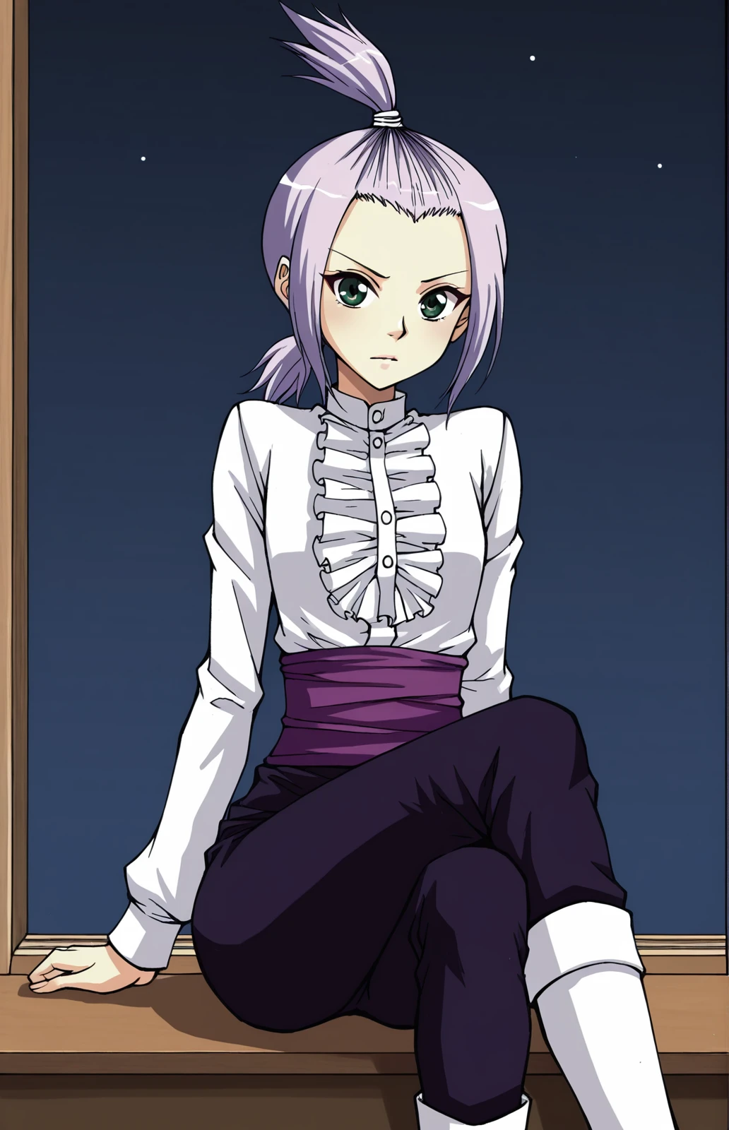 Xixi_outfit1, white shirt, ruffled front trim, high collar, long sleeves, purple waist sash, black pants, white boots, high boots,