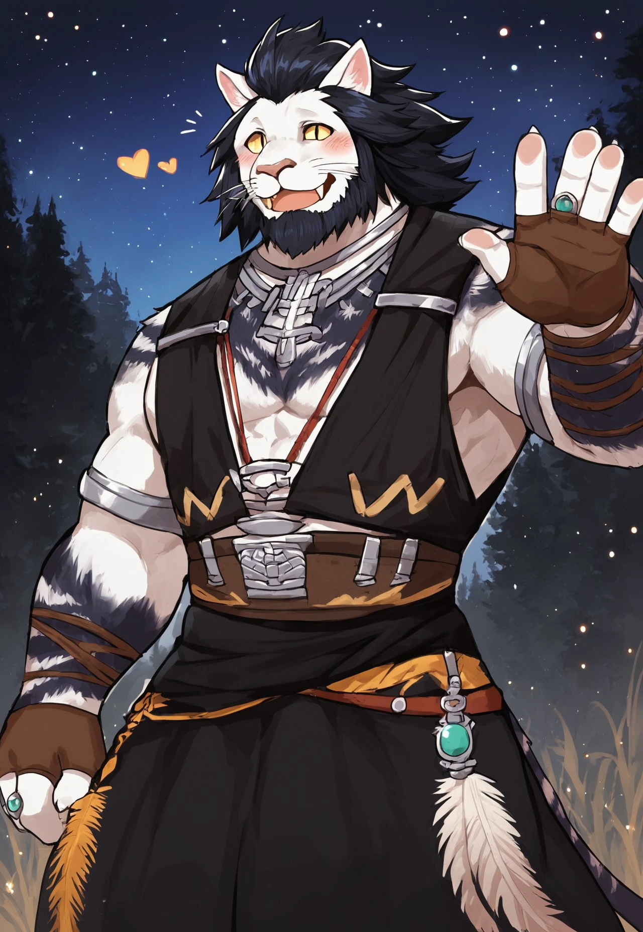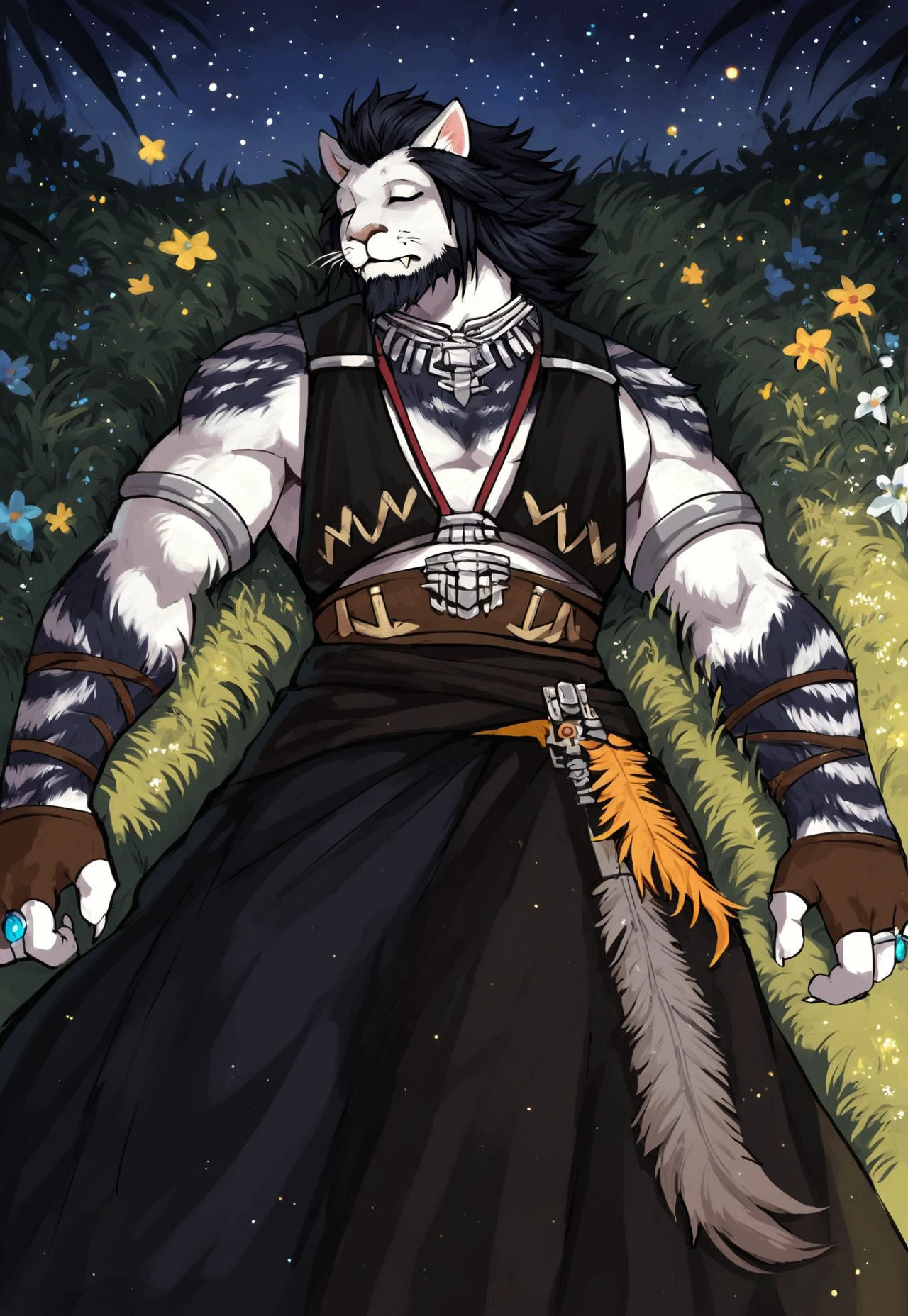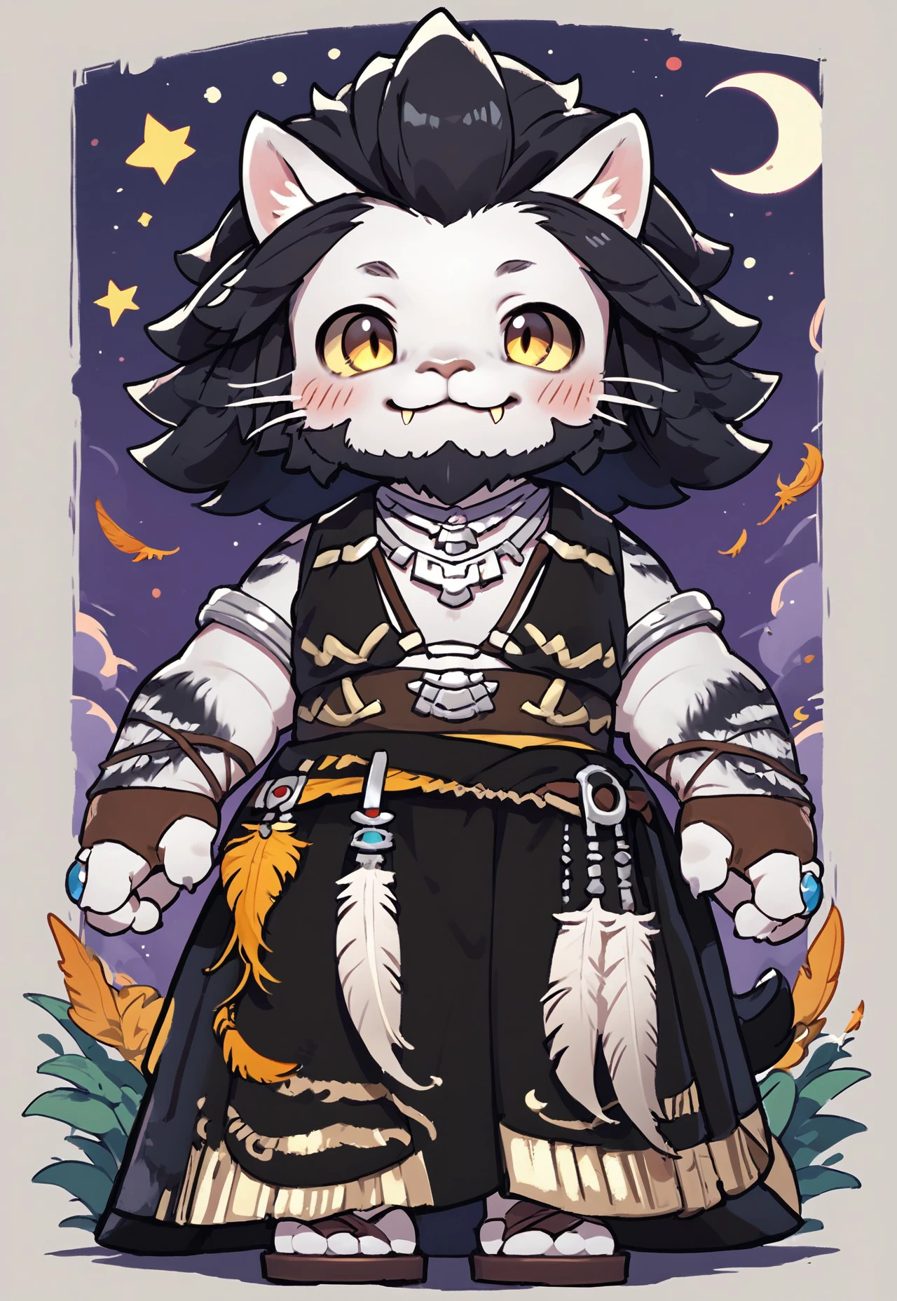 furry, cat, cat ears, animal ears, yellow eyes, whiskers, fangs, beard, facial hair, black hair, long hair, white fur, two-tone fur, claws, tail,