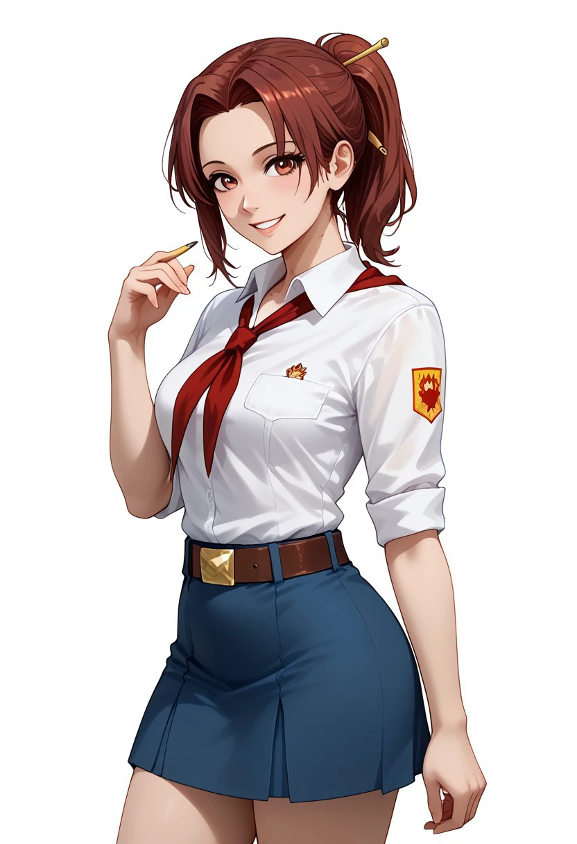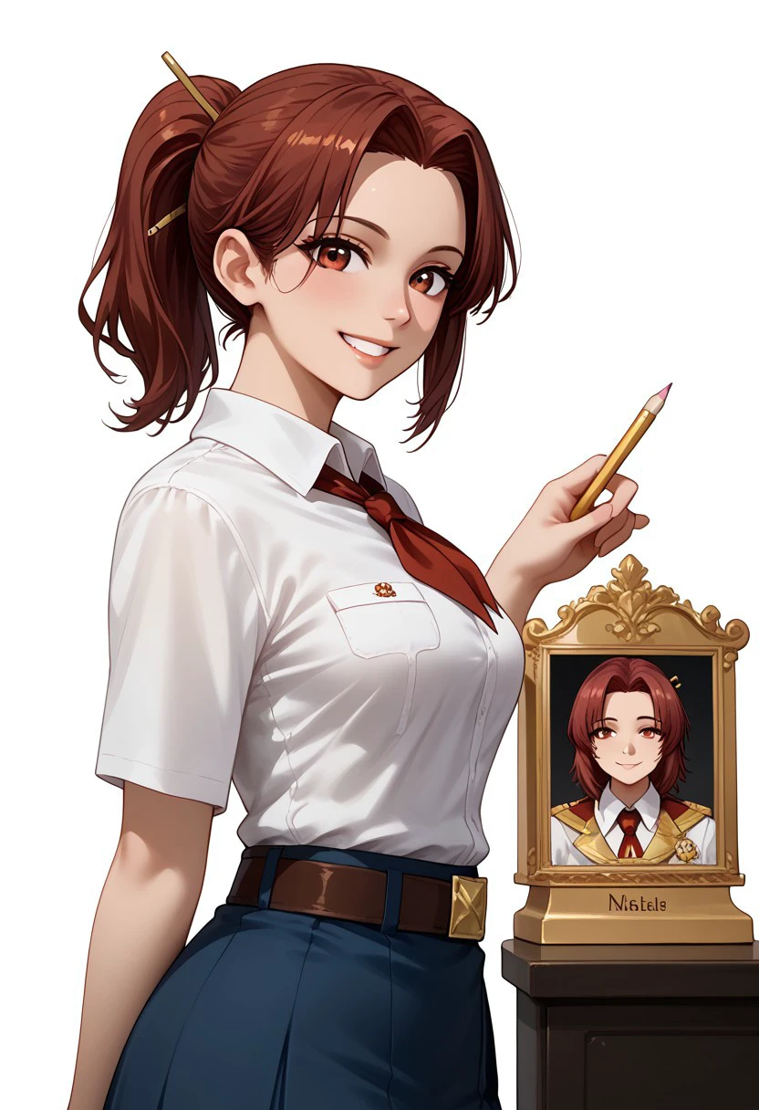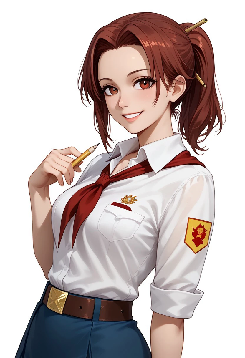 diana, burgundy hair, medium hair, medium ponytail,pencil-hairpin, burgundy eyes, medium breasts, bangs,