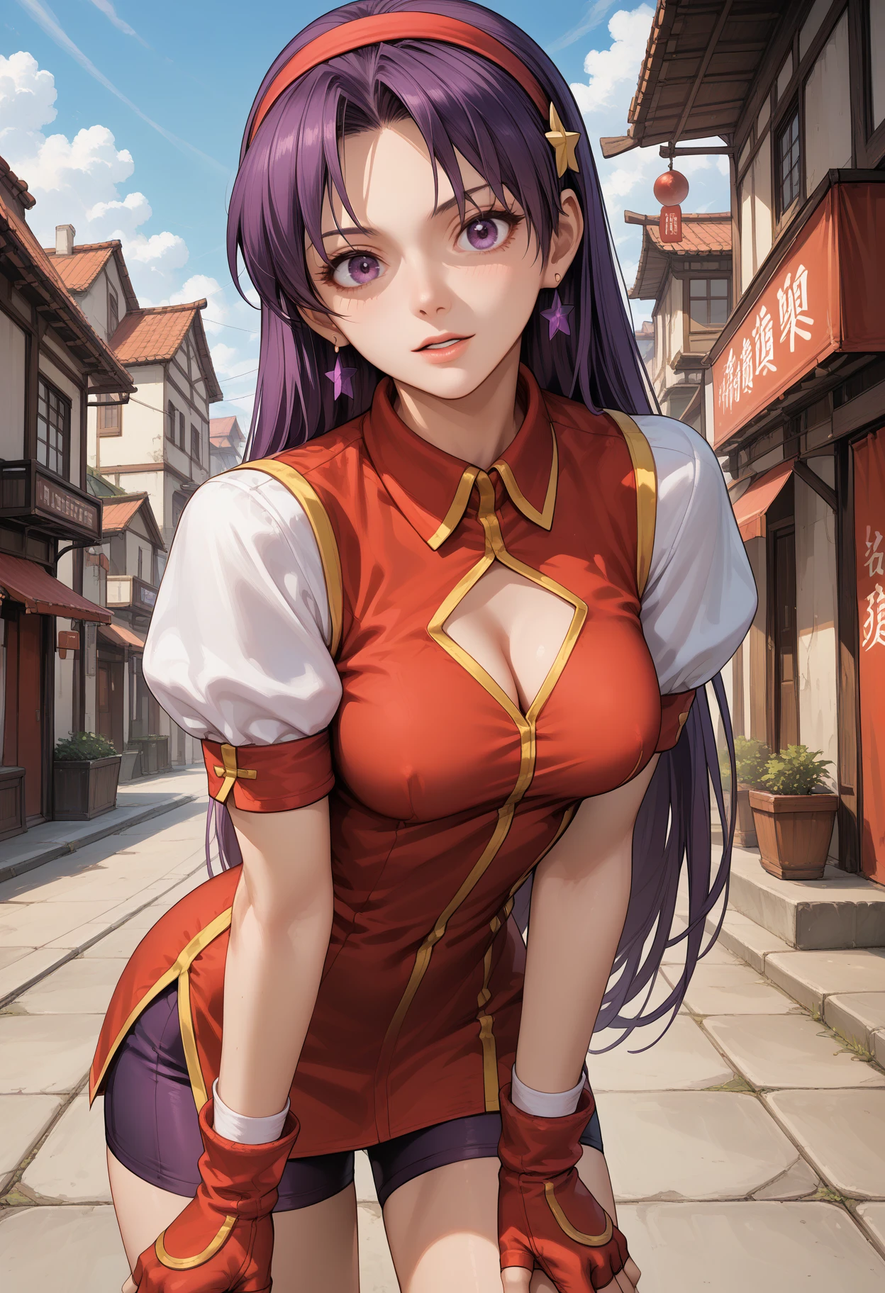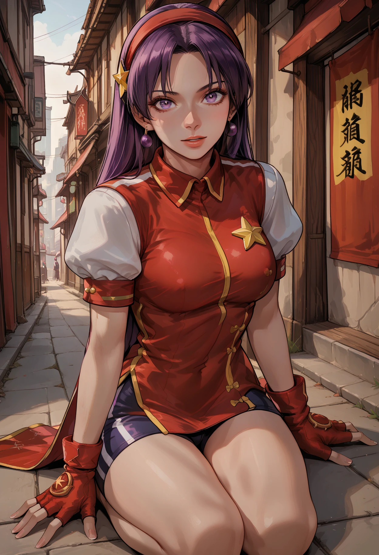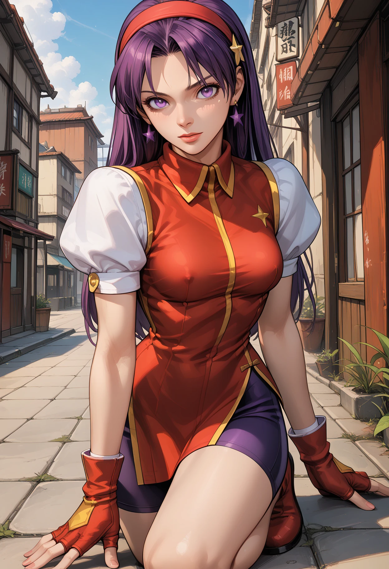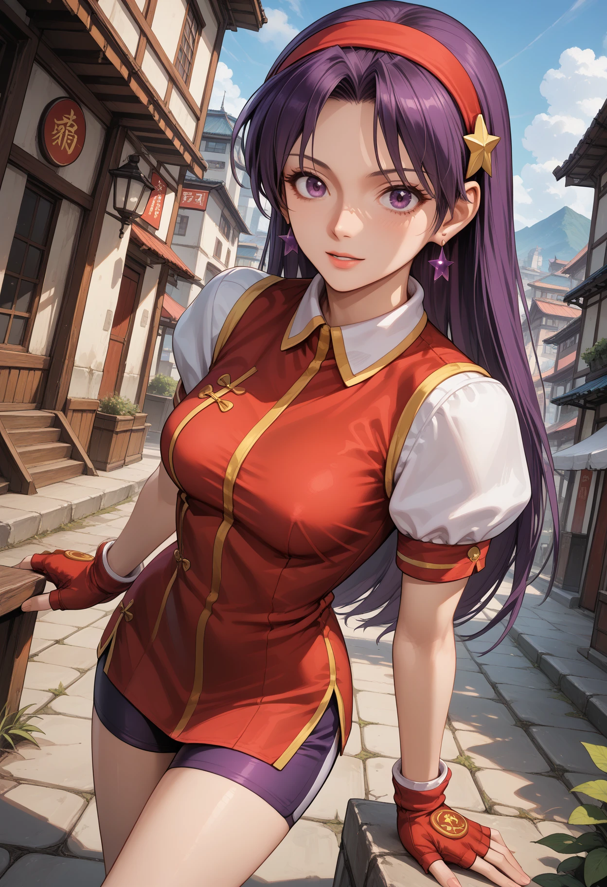 recommended tags: 1girl, solo, purple eyes, long hair, purple hair, hair ornament, star hair ornament, breasts, medium breasts, jewelry, star (symbol), earrings, hairband, red hairband, chinese clothes, dress, puffy sleeves, short sleeves, shorts, bike shorts, gloves, fingerless gloves, red gloves,