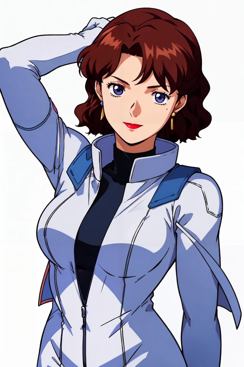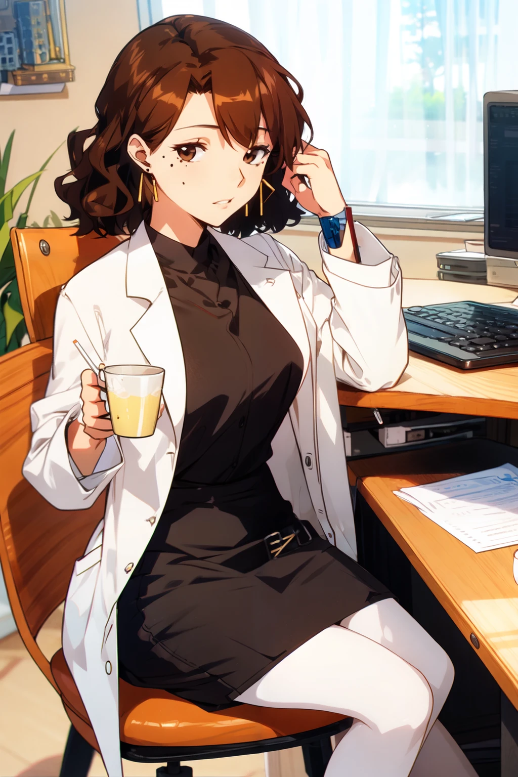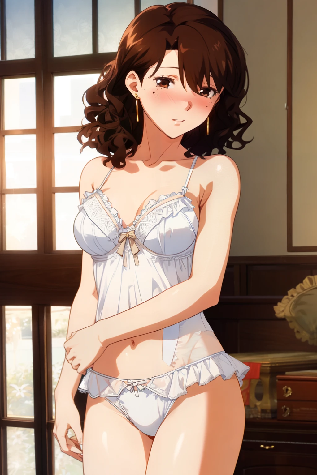 kaori, brown_eyes, mole_under_eye, brown_hair, medium_hair, wavy_hair, earrings,