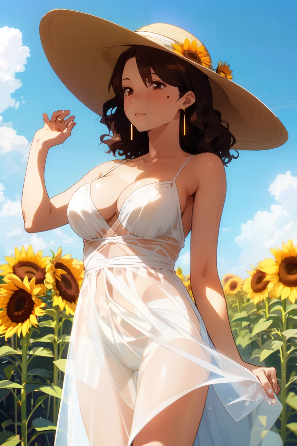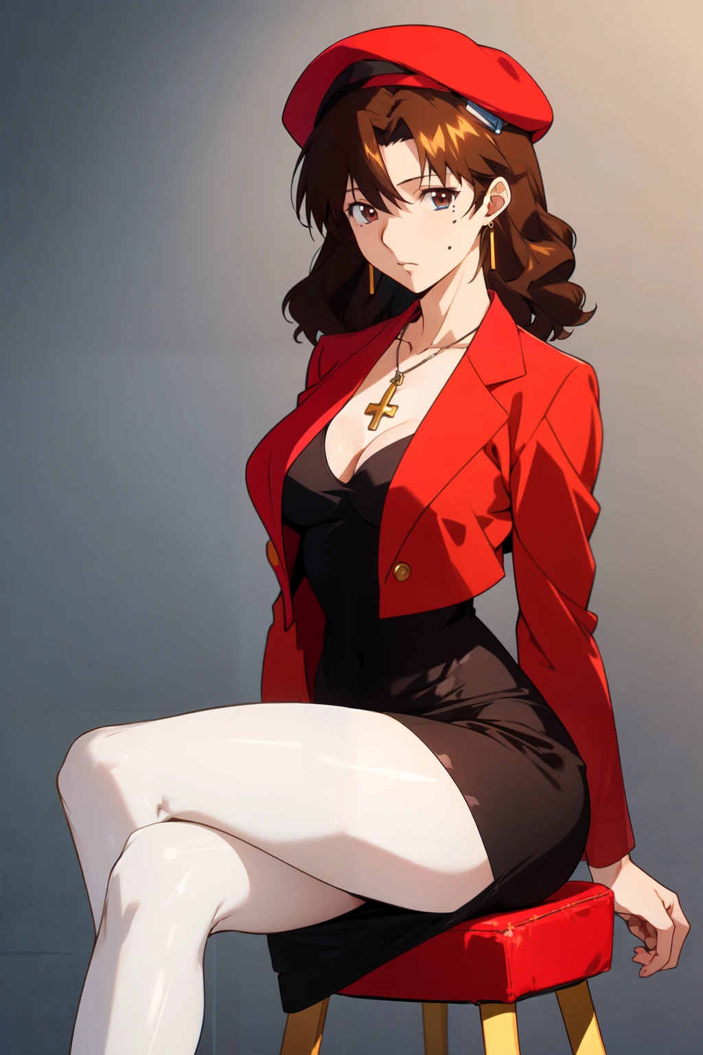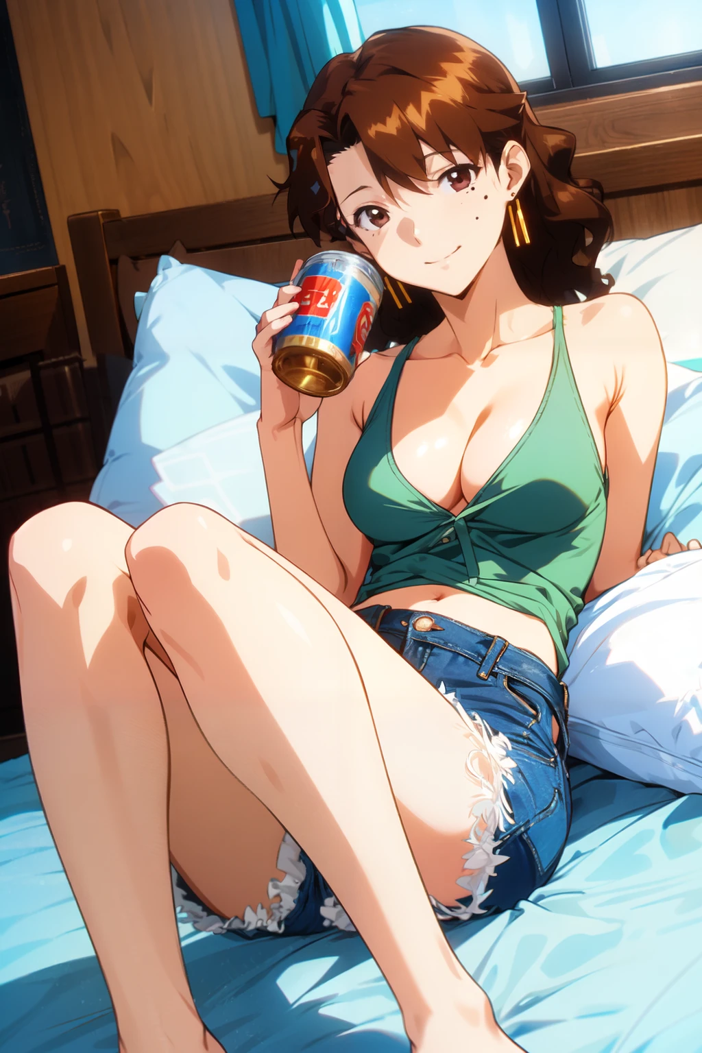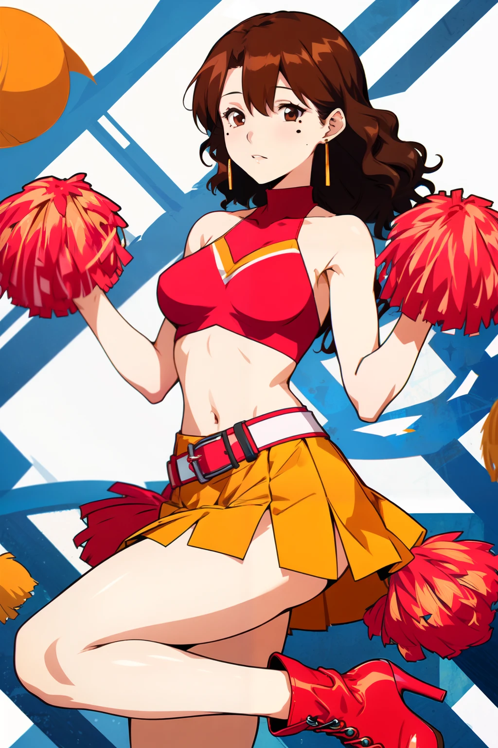 kaori, brown_eyes, mole_under_eye, brown_hair, medium_hair, wavy_hair, earrings,
