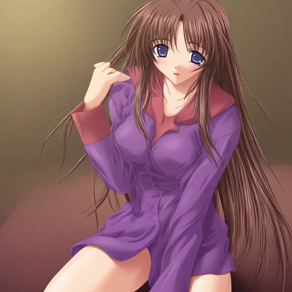 sanae;sgsanae,purple eyes, brown hair,,very long hair,hair red bow,medium breasts,school uniform,long sleeves,bowtie,pleated skirt,socks,