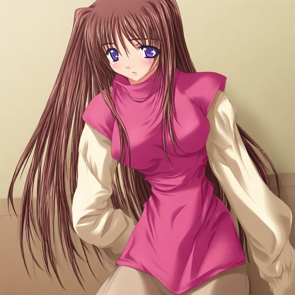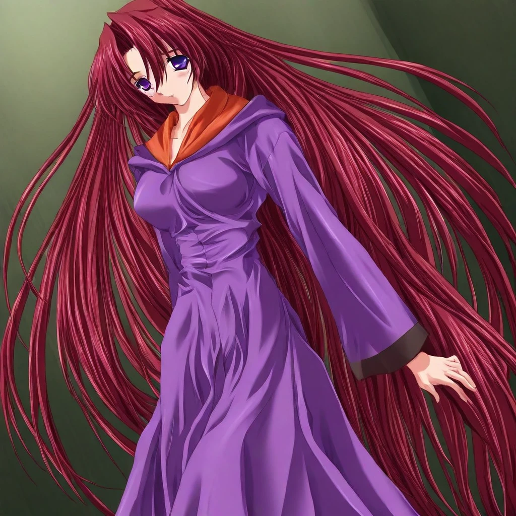 shinobu:sgshinobu,purple eyes, red hair,long hair,jewelry,large breasts,sweater,long sleeves,turtleneck,shirt,belt,strap,long skirt