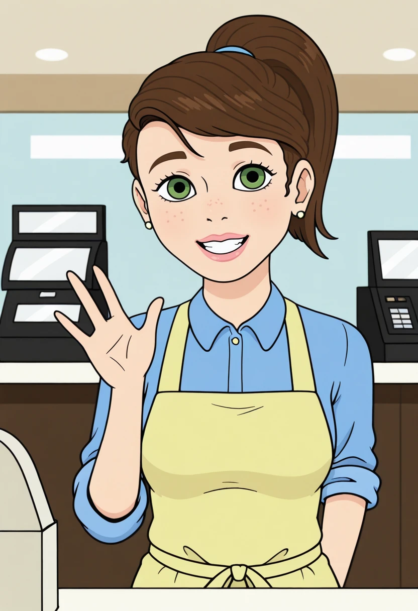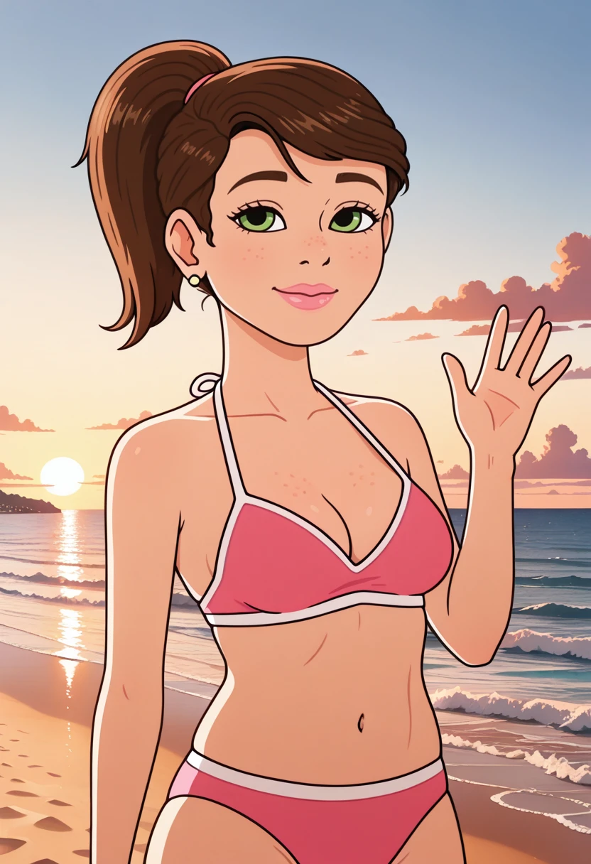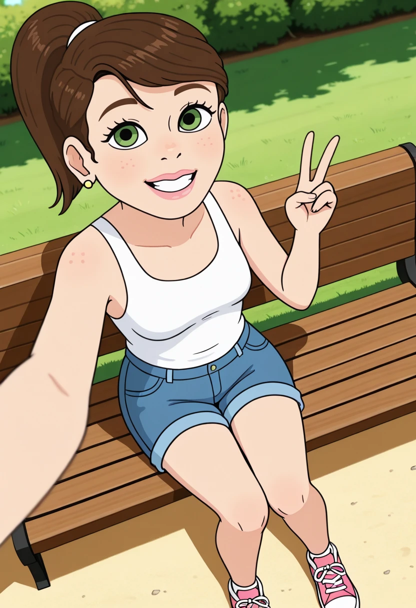 jennifersf, 1girl, solo, brown hair, ponytail, green eyes, freckles, thick lips, pink lips, earrings,