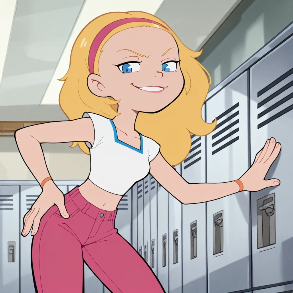 ros_ad, long hair, blonde hair, hairband, blue eyes, crop top, midriff, pink pants