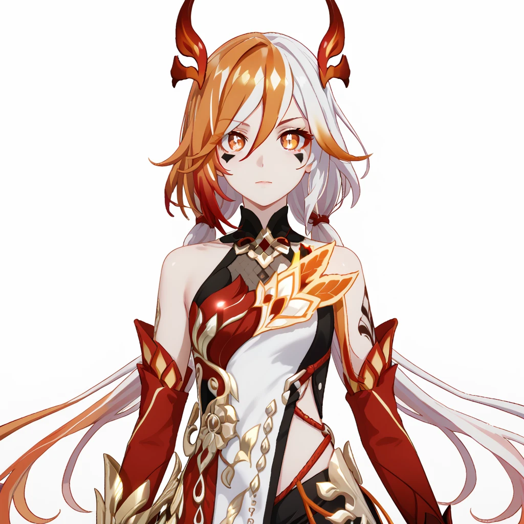 fu hua bengluo,fu hua,messy hair,jewelry,twintails,eyelashes,facial mark,head wings,two-tone hair,twintails,tattoo,ribbon,bangs,white hair,orange eyes,streaked hair,orange hair,fiery hair,hair between eyes,multicolored hair,hair ornament,hair ribbon,pattern on hair,yellow pupils,diamond shaped pupils,
