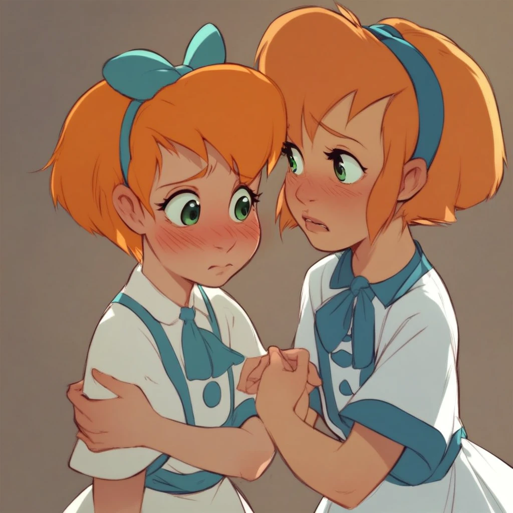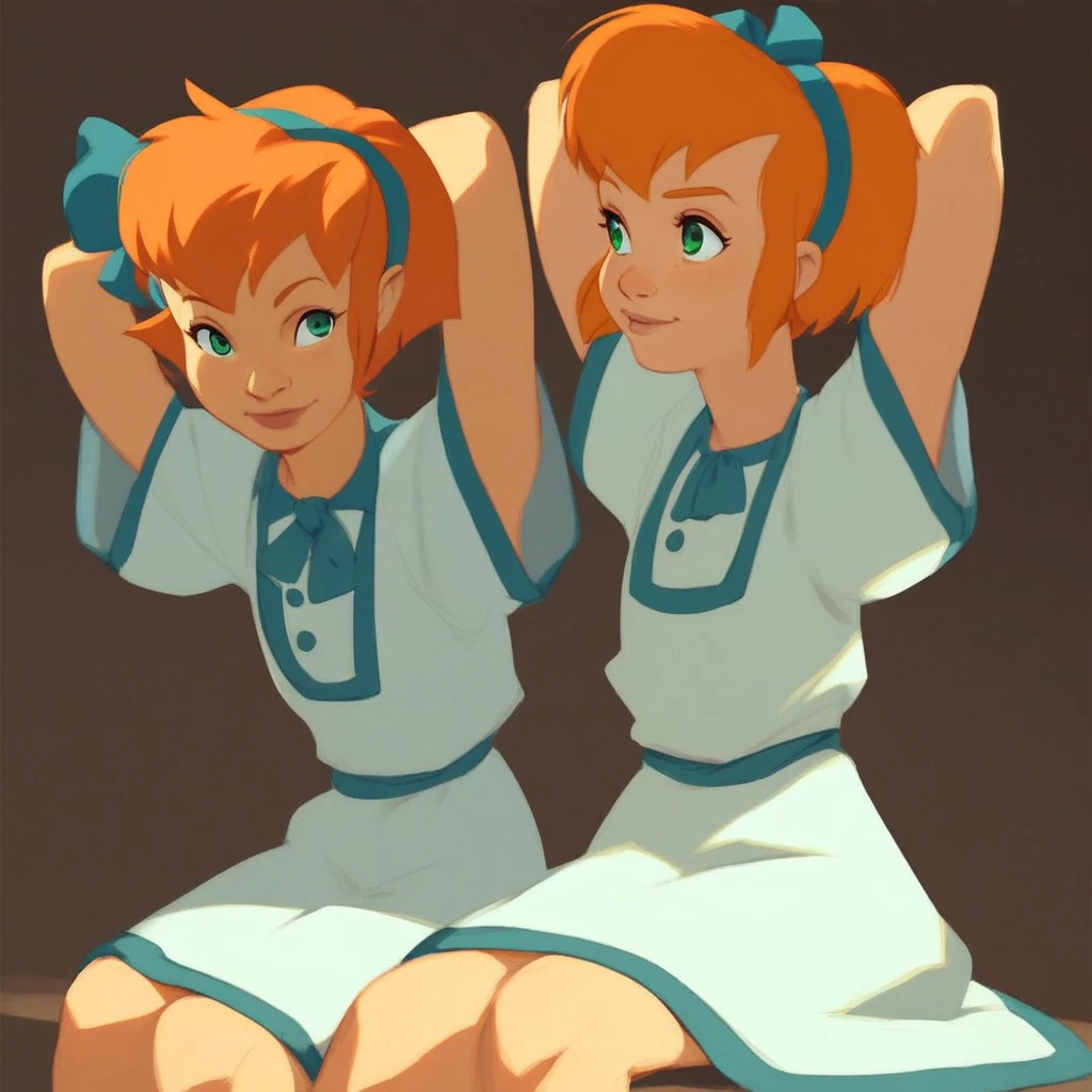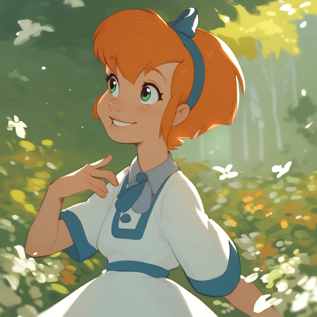 cecilia, orange hair, short hair, green eyes, dress, hairband,