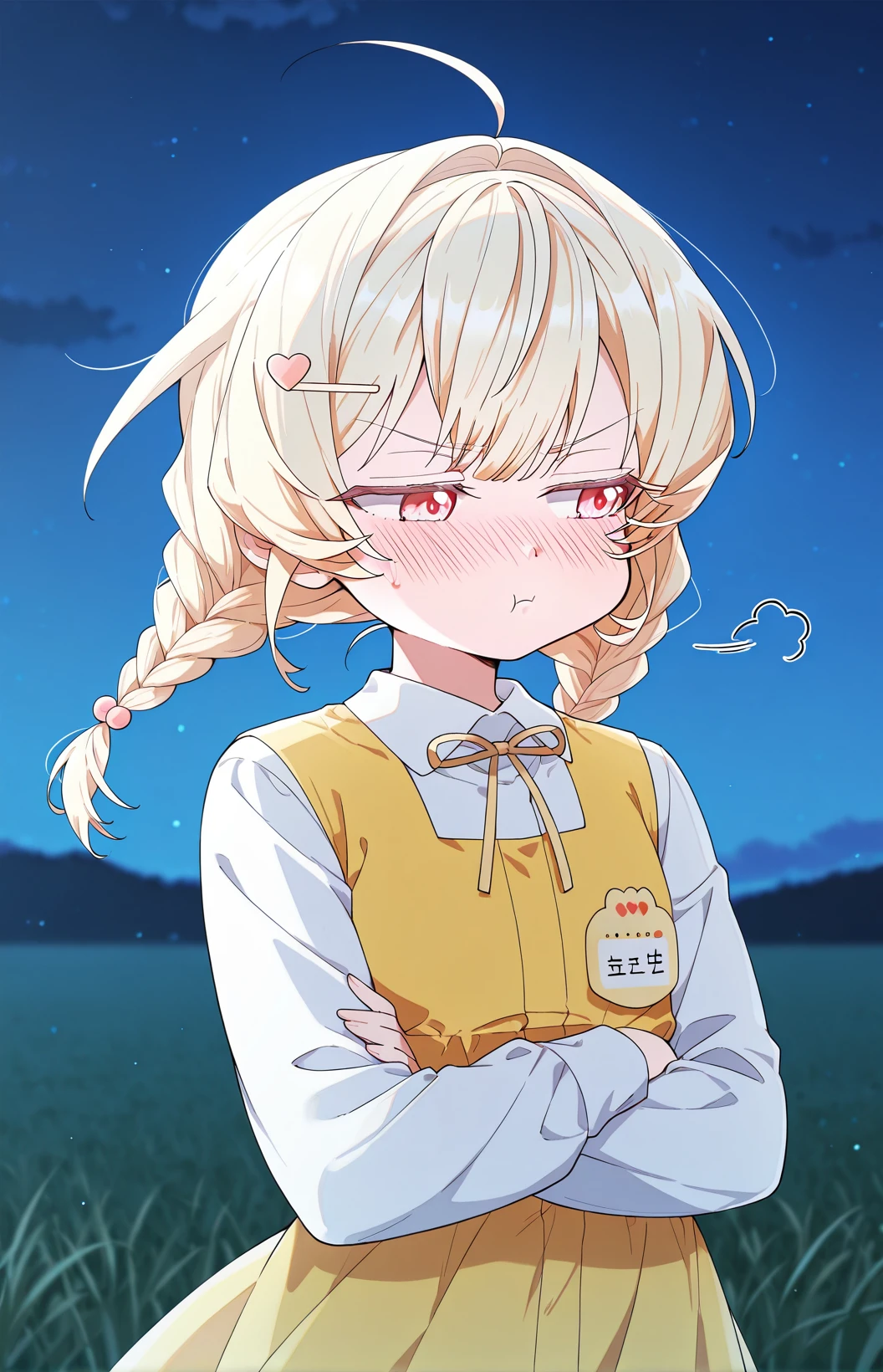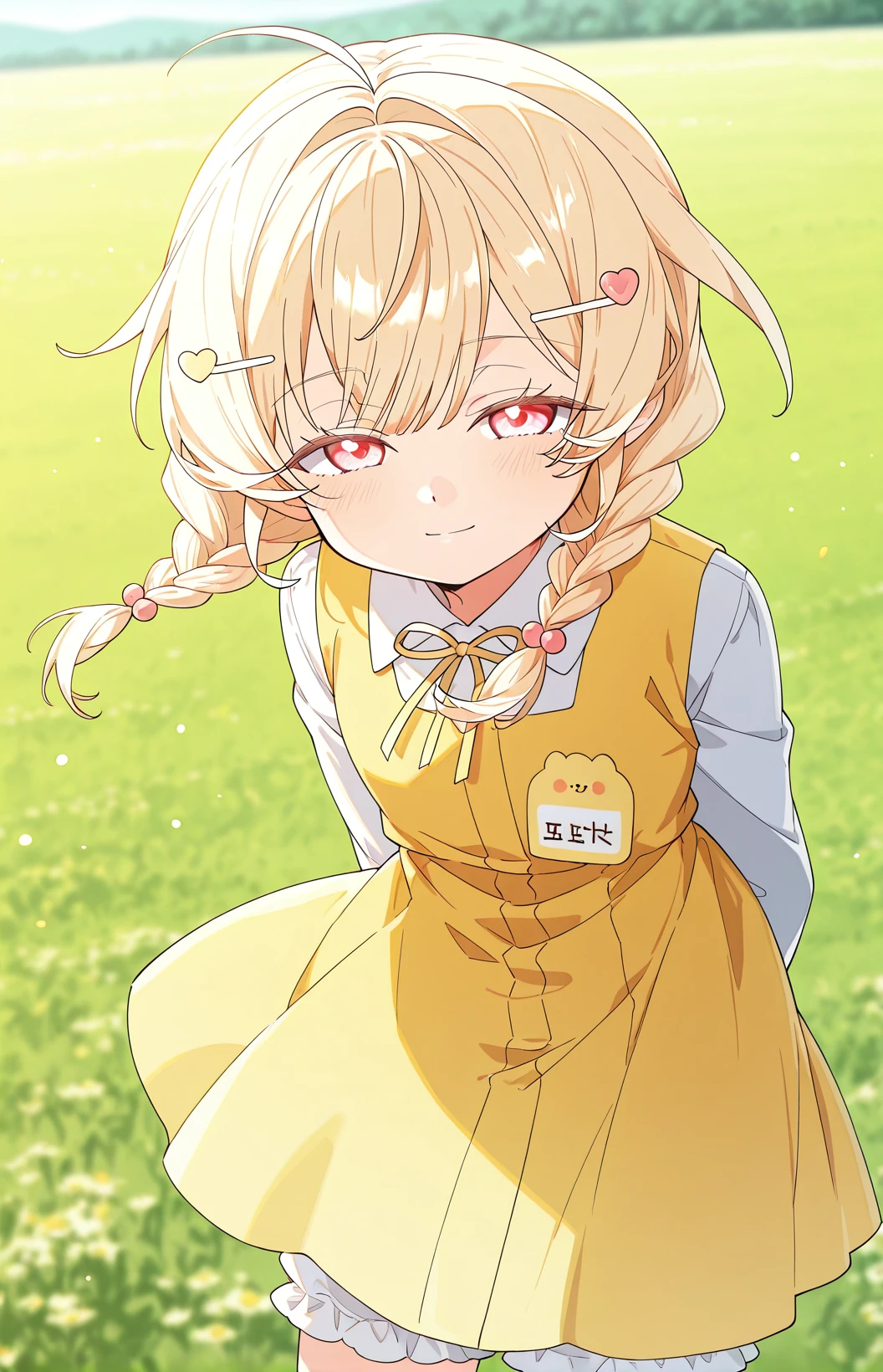 Groohan, 1girl, solo, light red eyes, light blonde hair, medium hair, fluffy hair, twin braids, short braids, straight bangs, hair between eyes, sidelocks, ahoge, hair clip, heart hair clip,