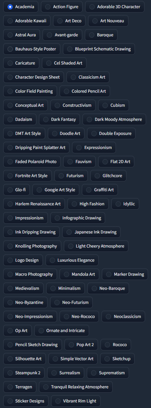 I added over 70 visual styles and art styles. It took some research on the different art styles to know how to prompt for each style and I learned a lot. They're not perfect, as many styles are new to me and I had to make educated guesses based on the style's descriptions on how to build the prompt scripts for them. So they might not be 100% true to the styles, but they do add a nice amount of artistic variety!