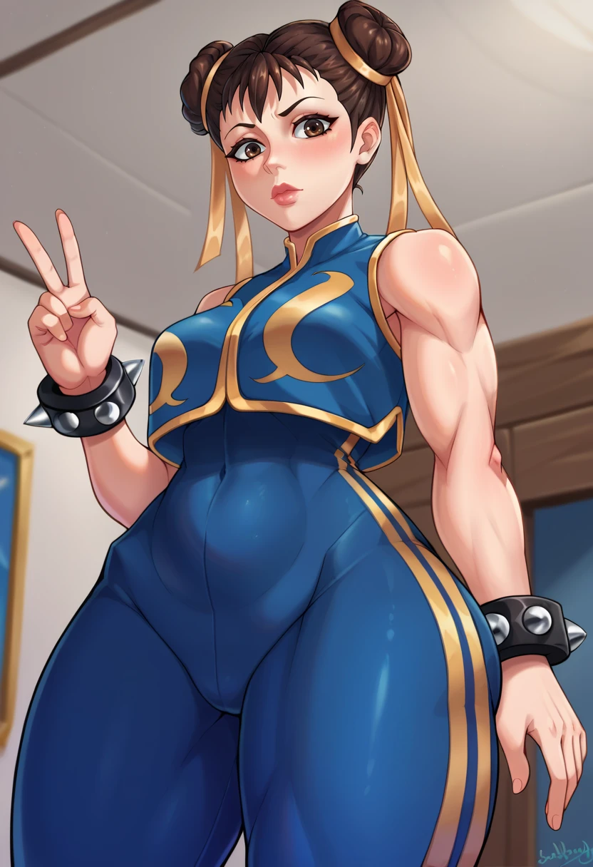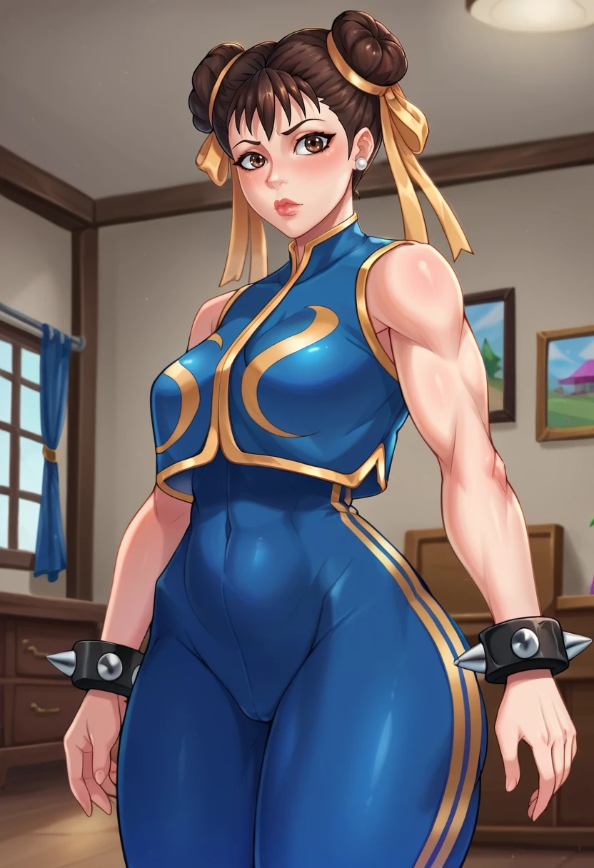 chunlifortnite,1girl,short hair,brown hair,ribbon,brown eyes,jewelry,hair ribbon,sleeveless,hair bun,bracelet,lips,crop top,double bun,bodysuit,thick thighs,spikes,spiked bracelet,unitard,studded bracelet,chun-li