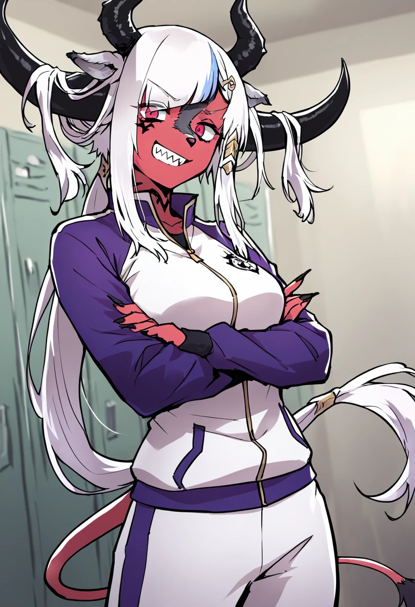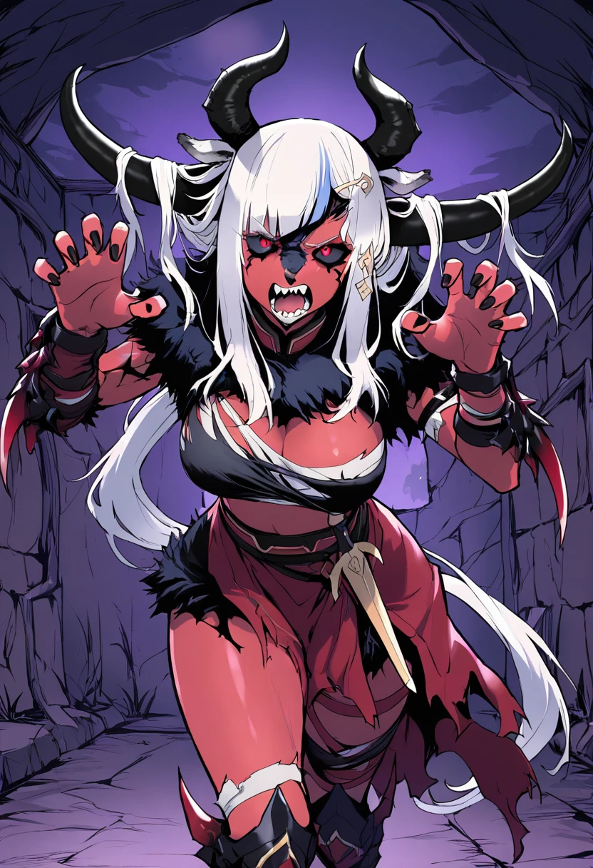CarinaShadow, furry, furry female, red skin, white hair, multicolored hair, streaked hair, blue streaks, very long hair, diagonal bangs, sidelocks, hair ornament, multiple horns, bull ears, white ears, black fur, red eyes, long fingernails, black nails, red tail, hooves,
