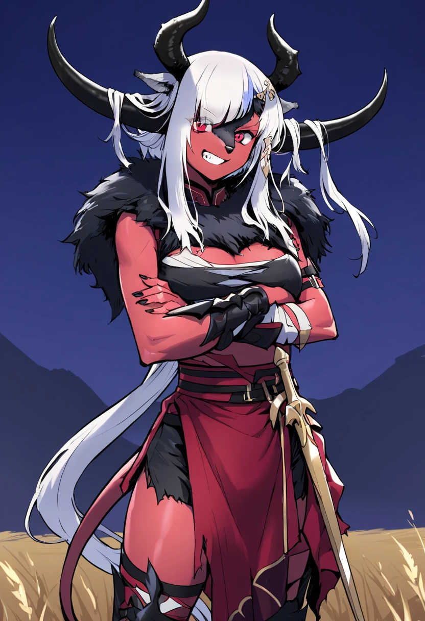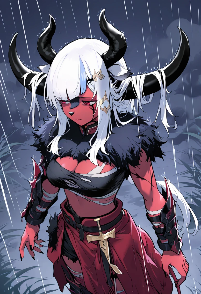 Trigger Words (General): CarinaShadow, furry, furry female, red skin, white hair, multicolored hair, streaked hair, blue streaks, very long hair, diagonal bangs, sidelocks, hair ornament, multiple horns, bull ears, white ears, black fur, red eyes, long fingernails, black nails, red tail, hooves,