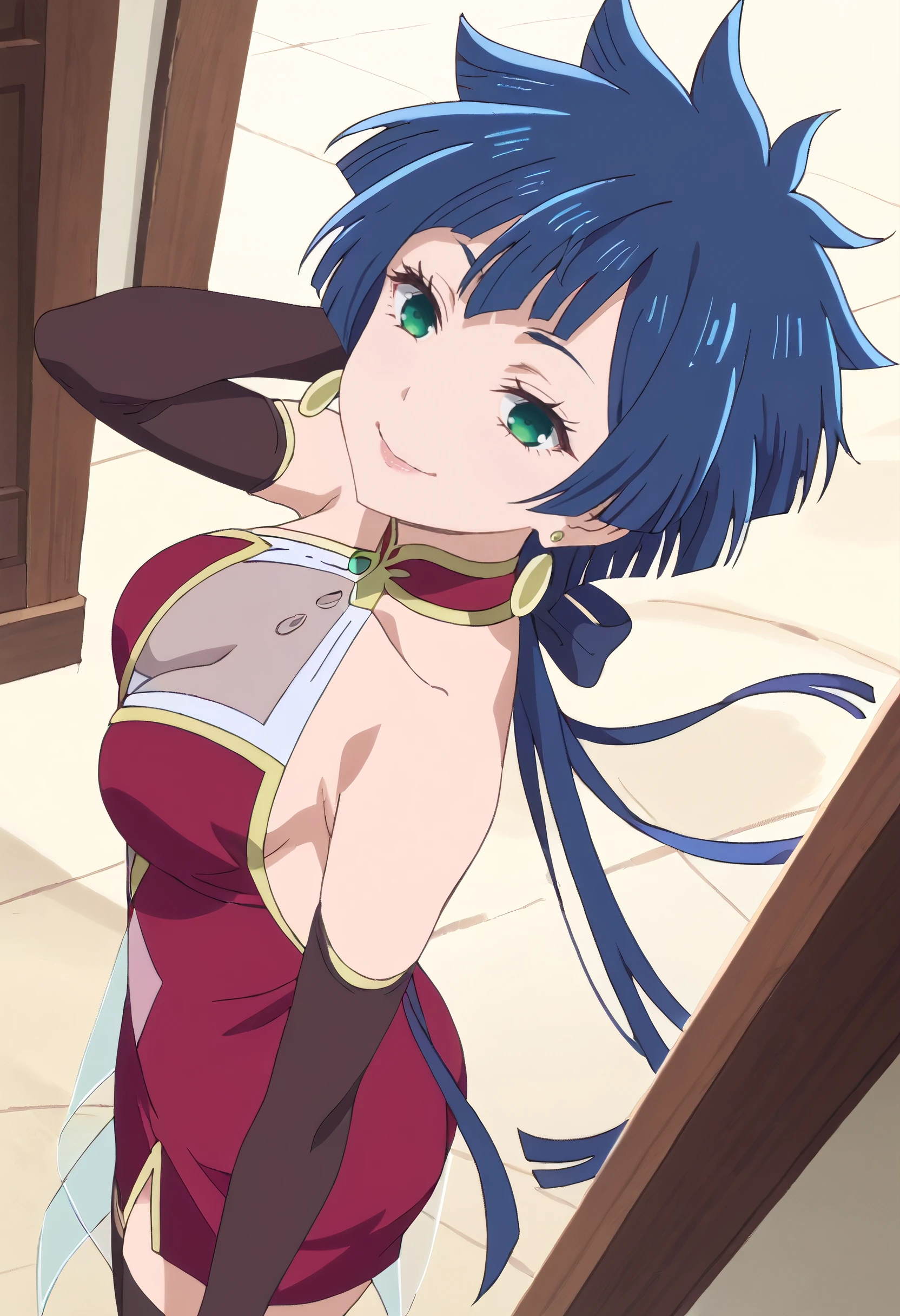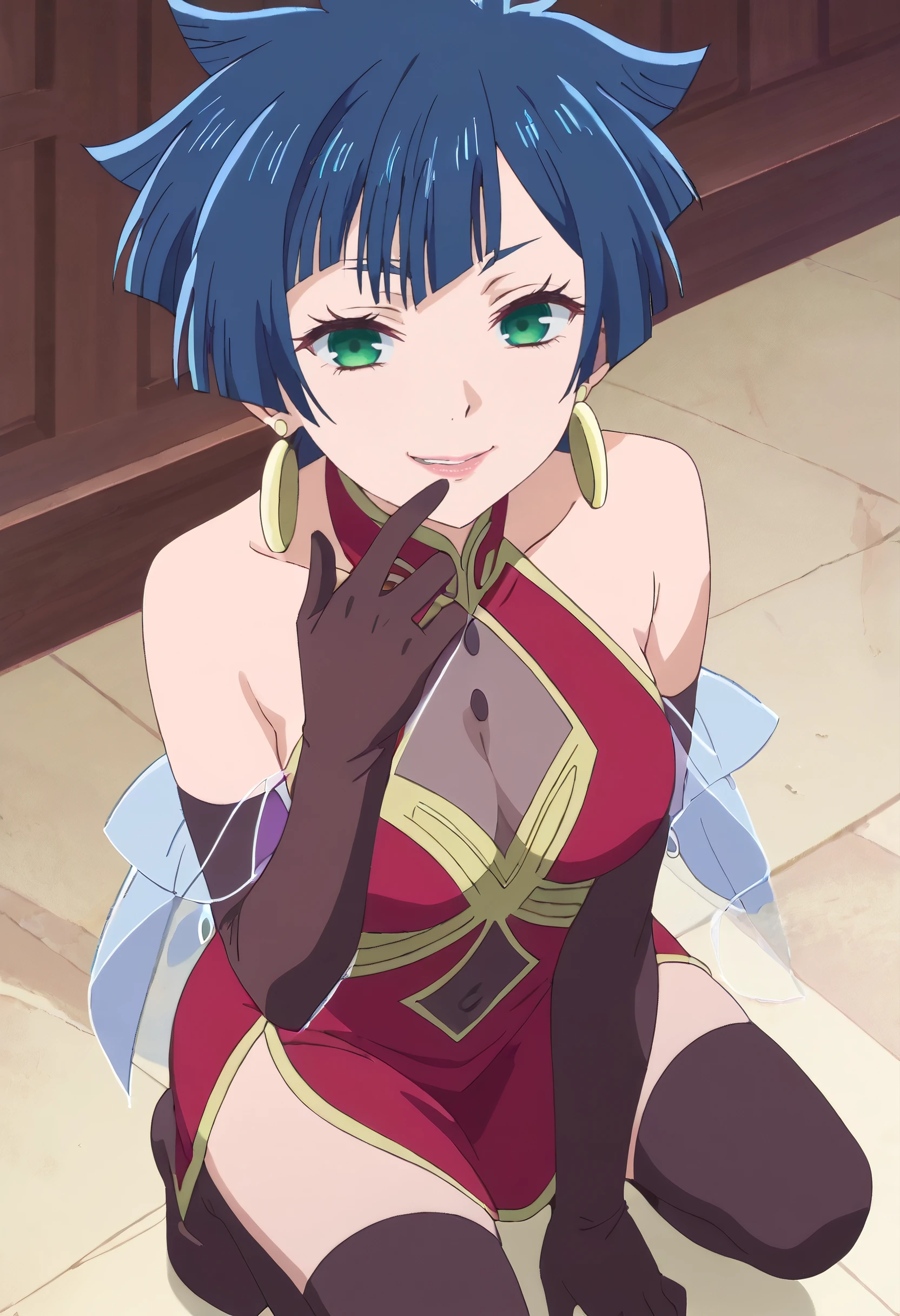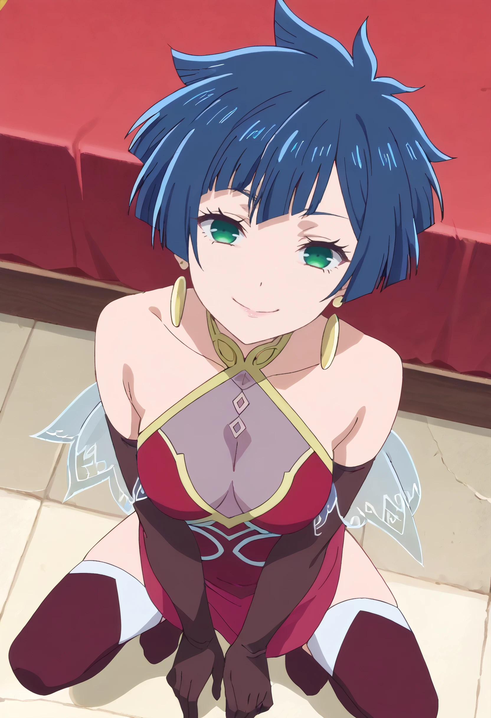 KarinaDress, earrings, jewelry, gloves, bare shoulders, thighhighs, elbow gloves, dress, cleavage, see-through cleavage, backless dress, backless outfit, red dress, brown legwear, brown gloves, halterneck,