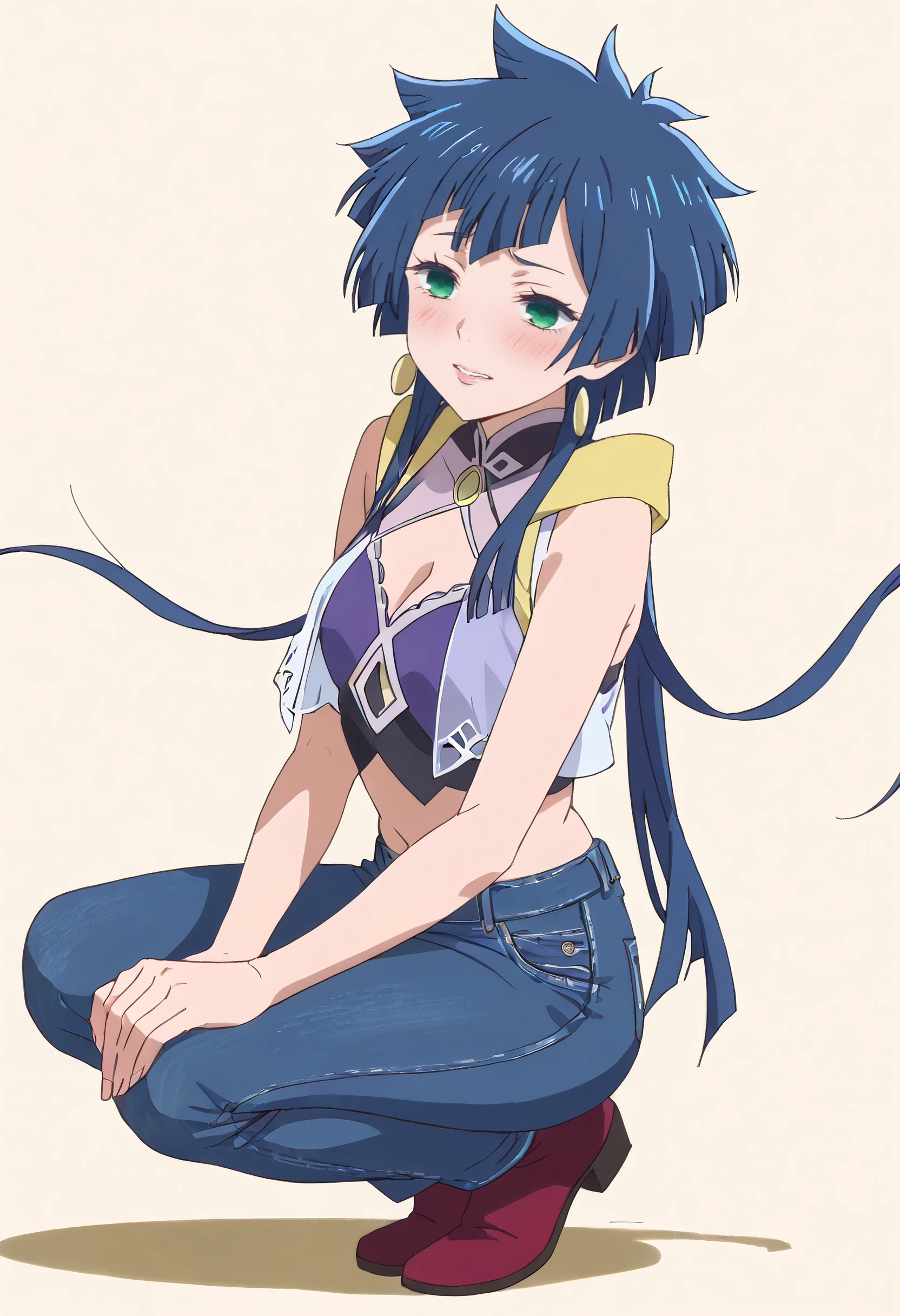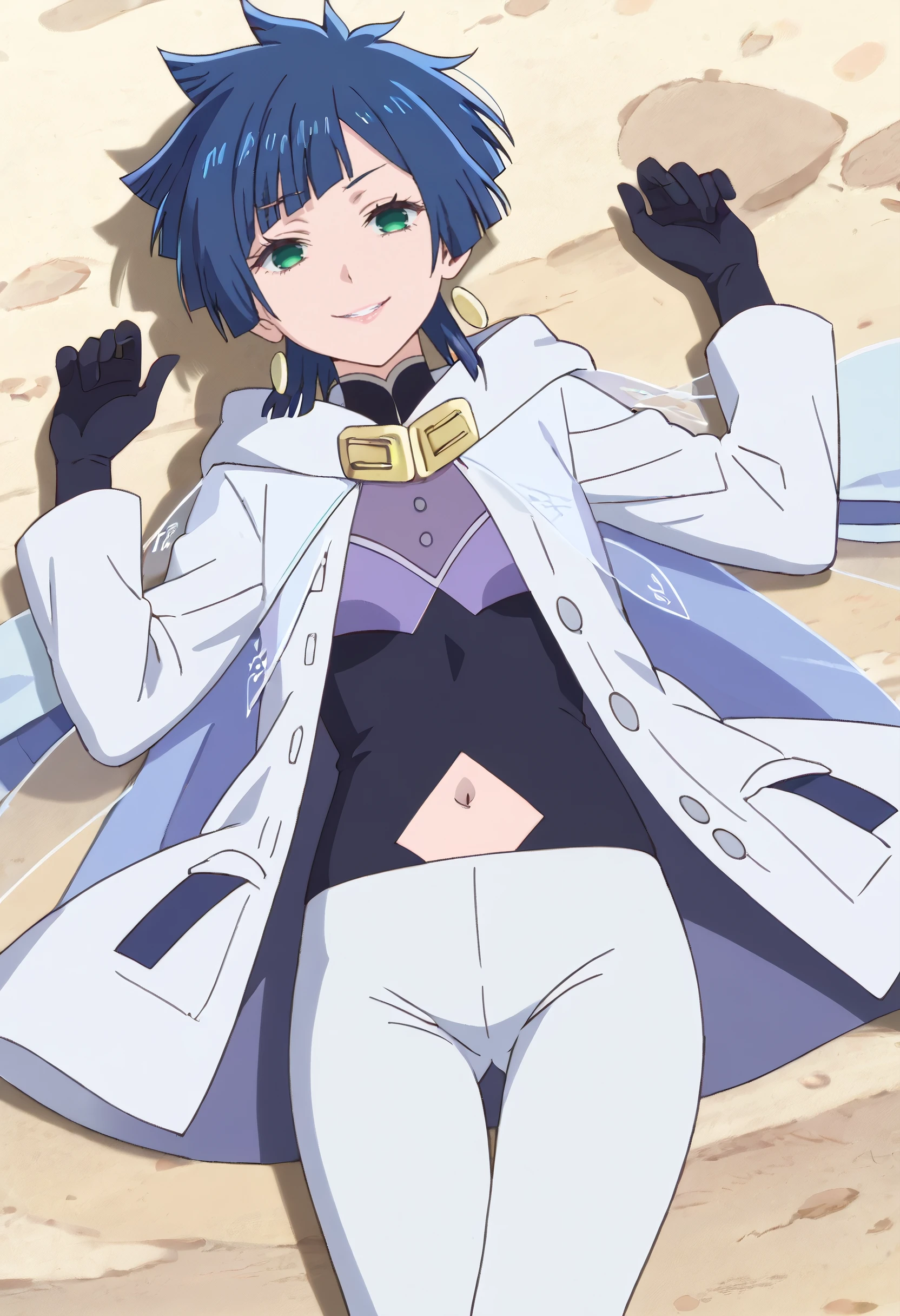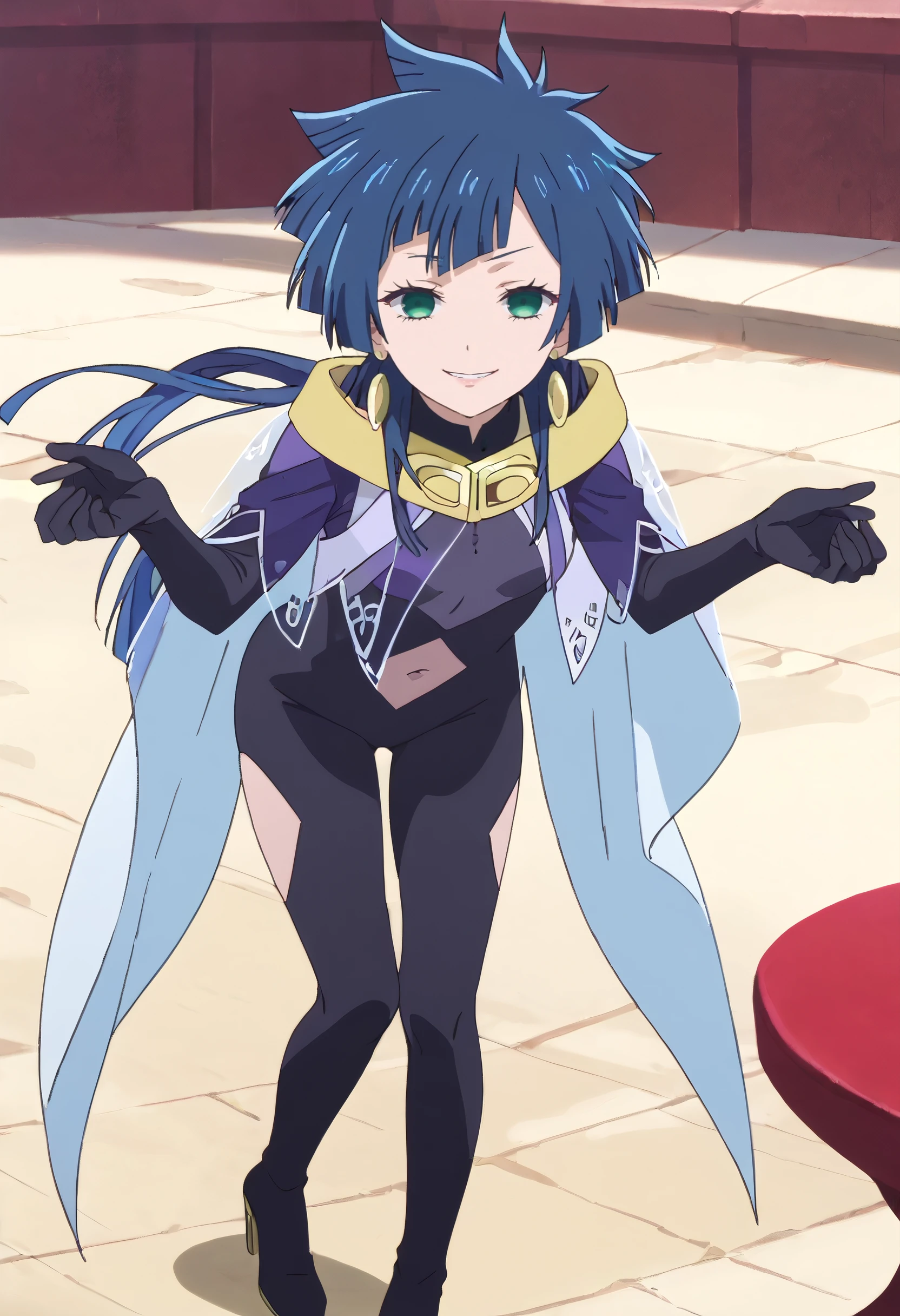 KarinaBodysuit, gloves, , jewelry, navel, earrings, elbow gloves, spiked hair, high heels, long sleeves, scarf, black gloves, cape, navel cutout, shoes, pants, jacket, clothing cutout, black , thighhighs, boots,
