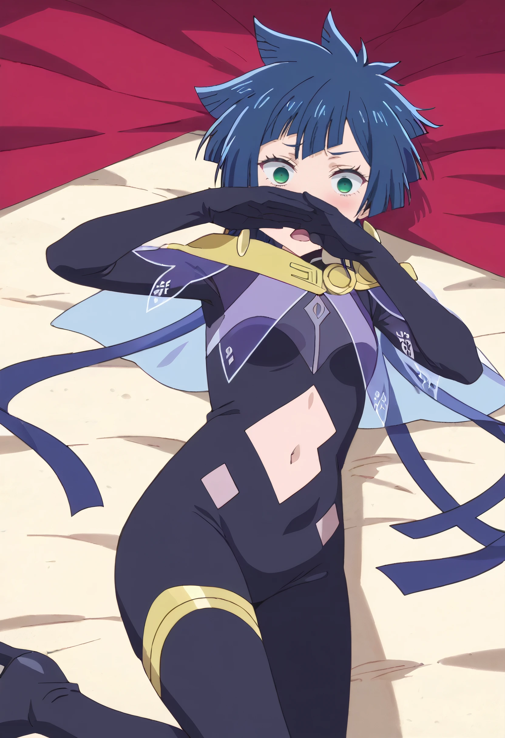 KarinaBodysuit, gloves, bodysuit, jewelry, navel, earrings, elbow gloves, spiked hair, high heels, long sleeves, scarf, black gloves, cape, navel cutout, shoes, pants, jacket, clothing cutout, black bodysuit, thighhighs, boots,