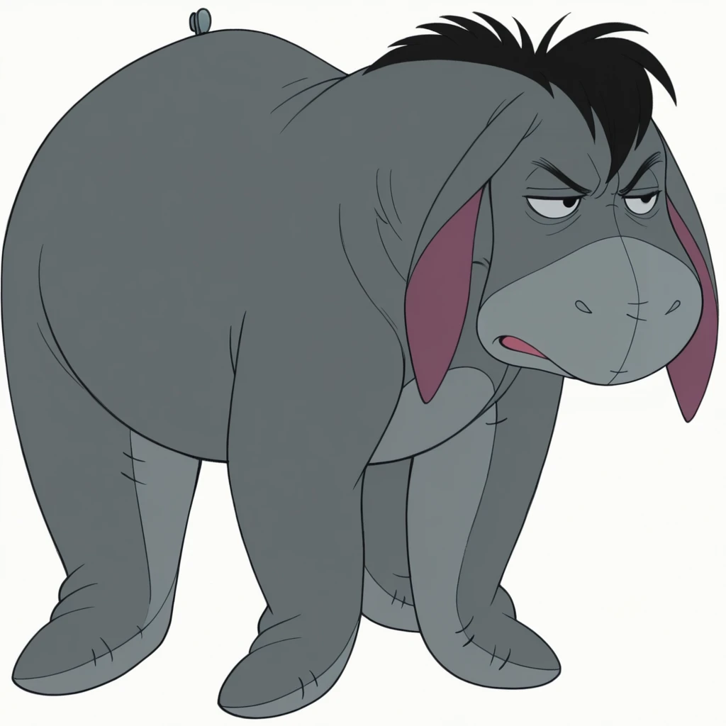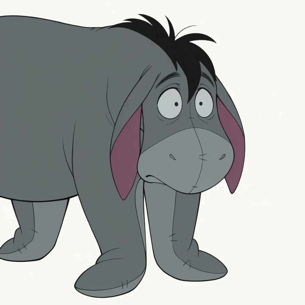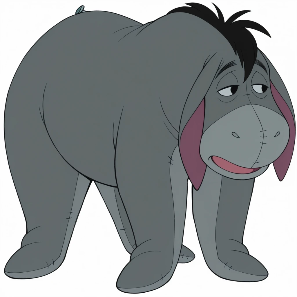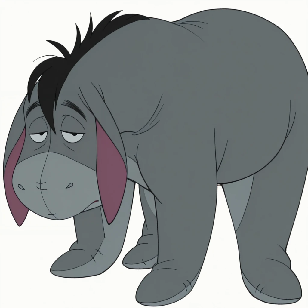 1boy, male, furry, quadruped, donkey, stuffed animal, solo, grey body, two-tone body, black hair, short hair, black eyes, grey muzzle, nostrils, floppy ears, stitches