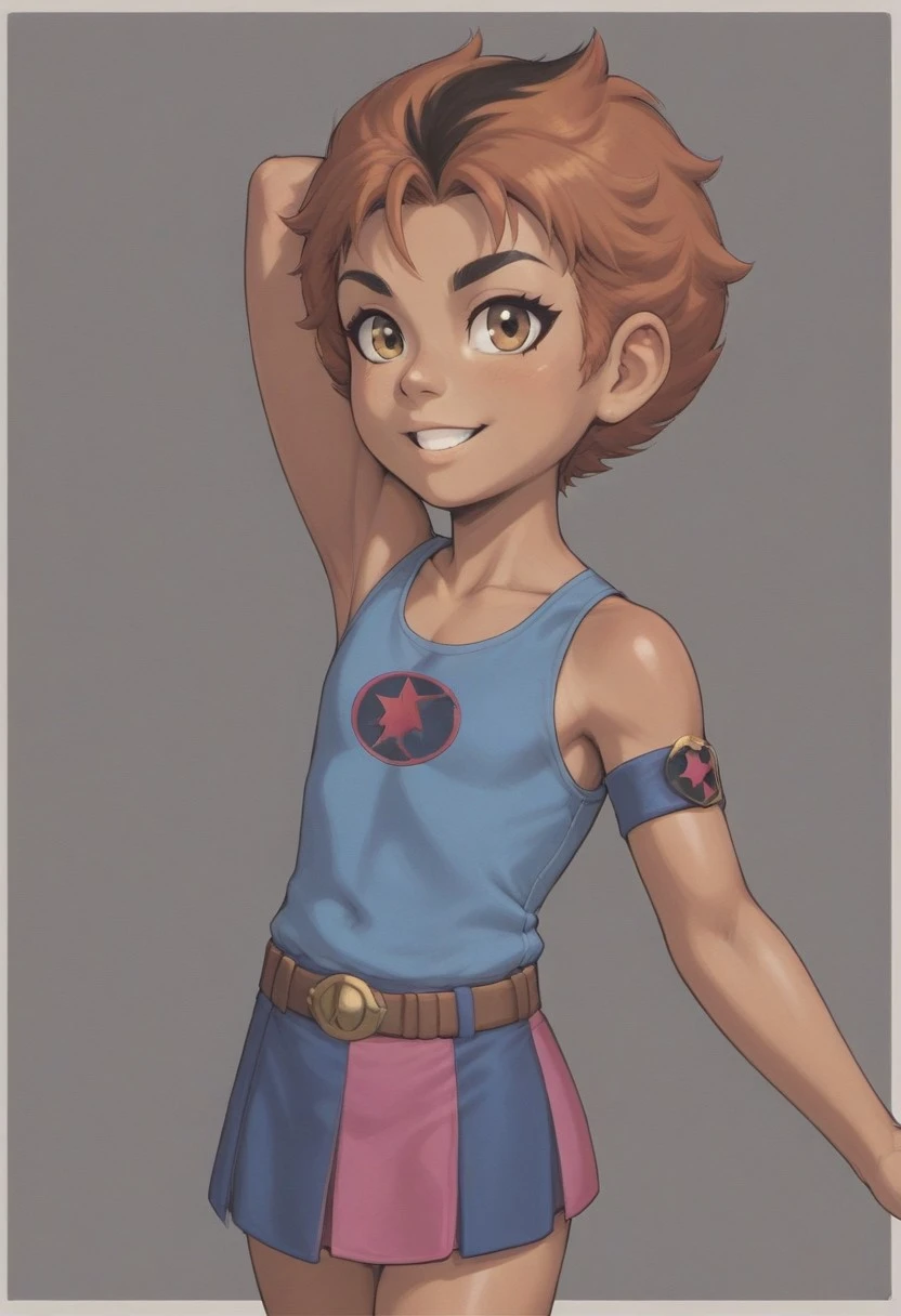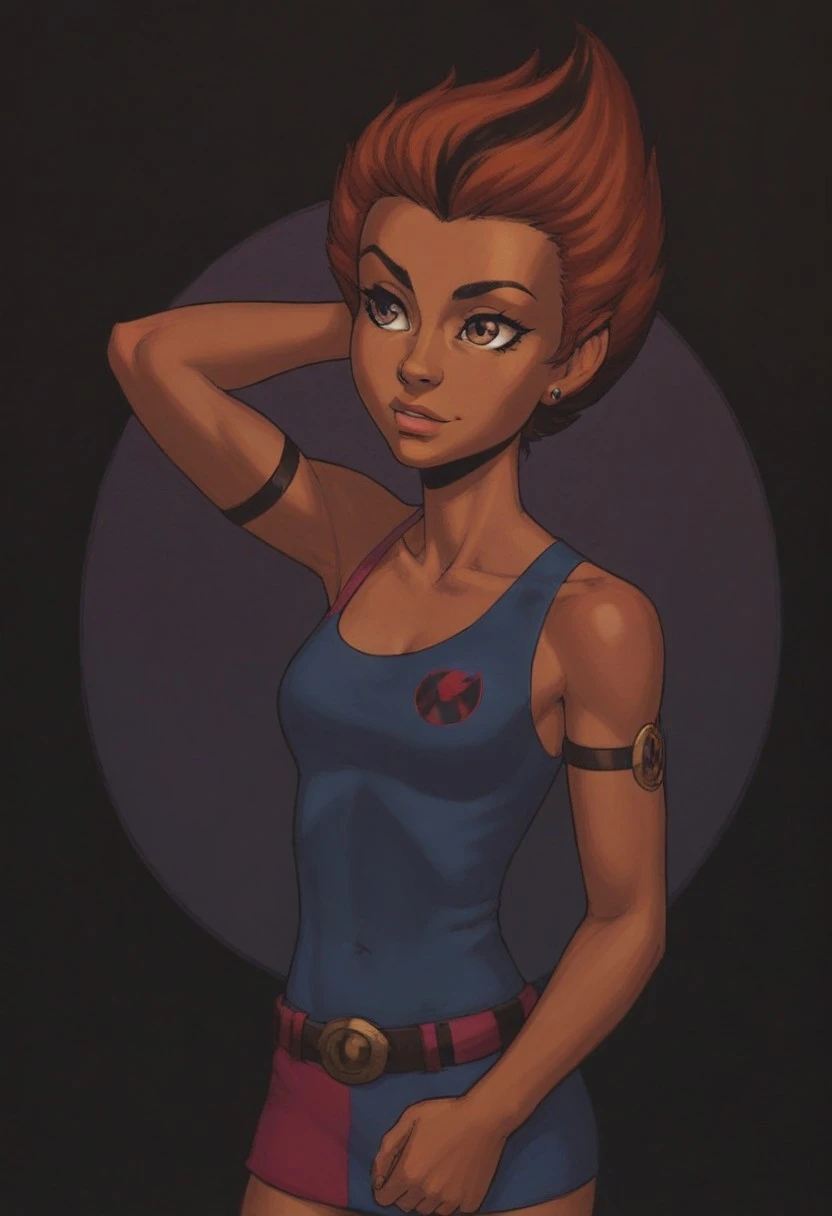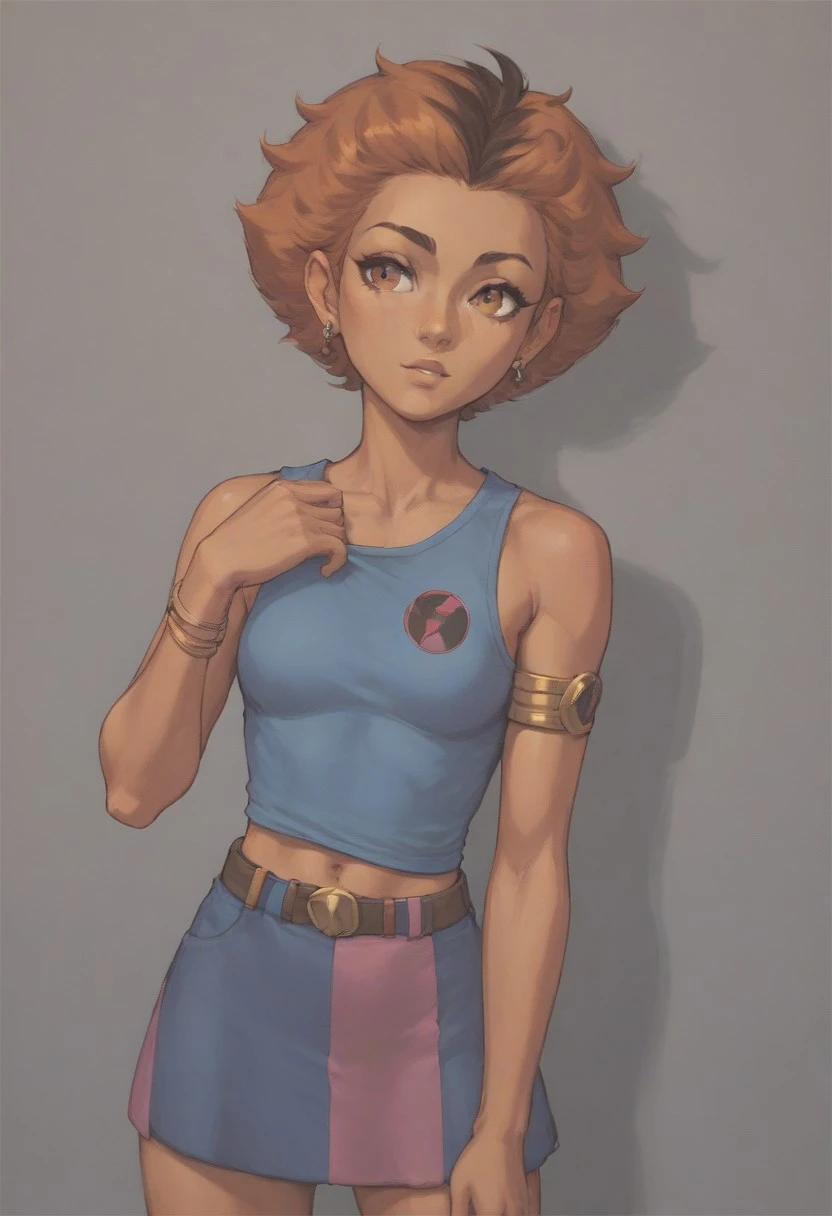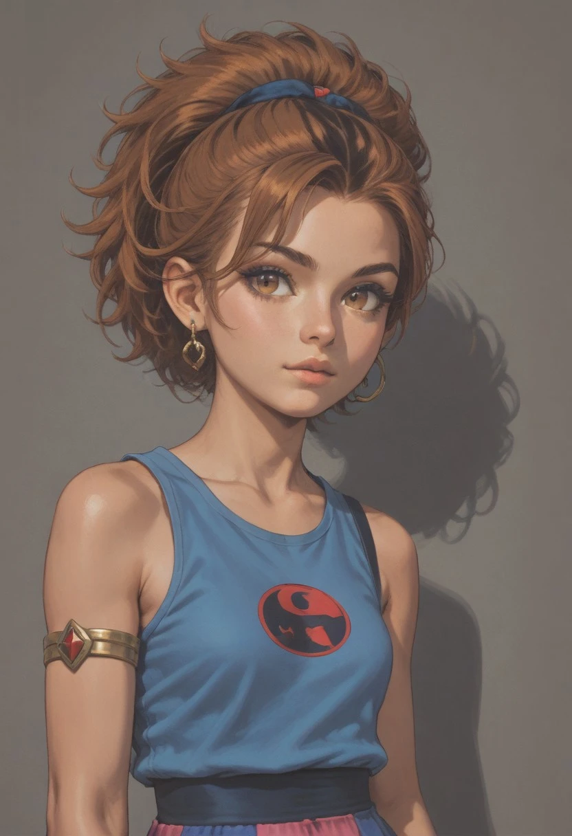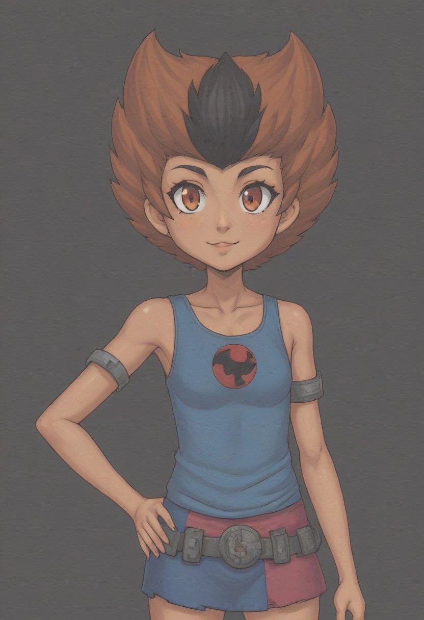 WilykitHQStyle, 1girl, solo, brown black stripe hair, blue tank top, multicolored skirt, one shoulder out, eye of thundera, utility belt, silver armlet