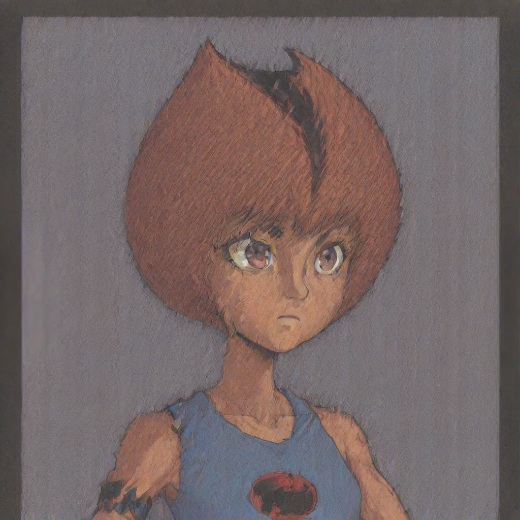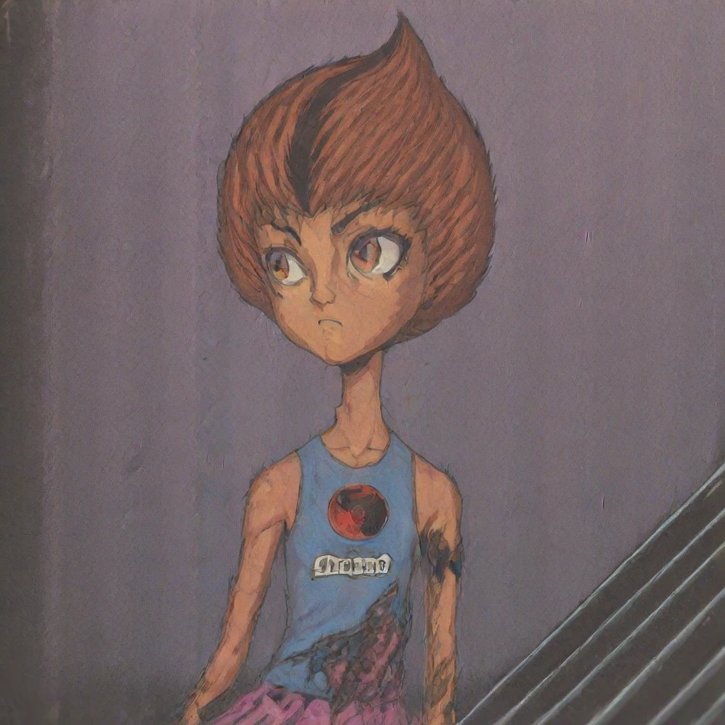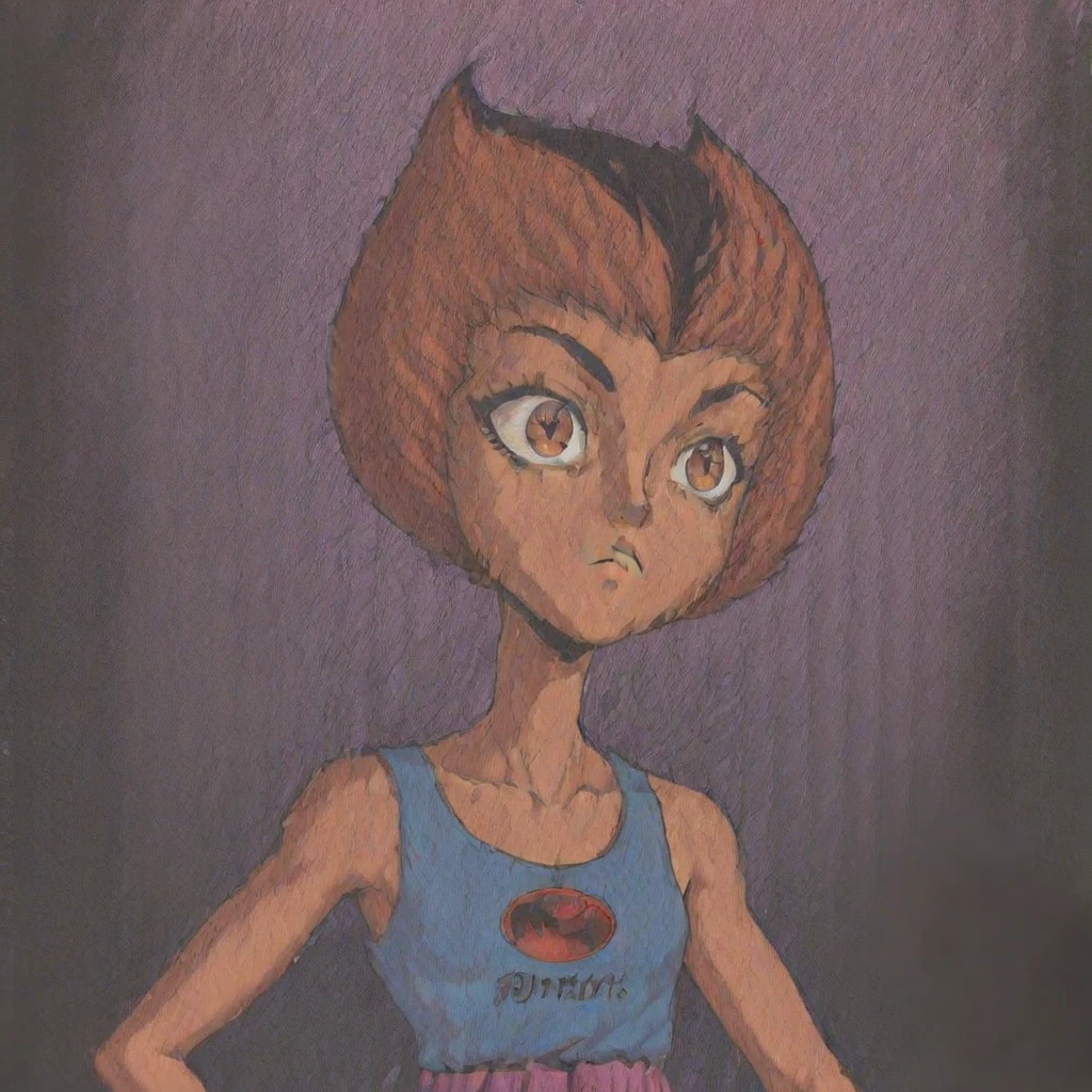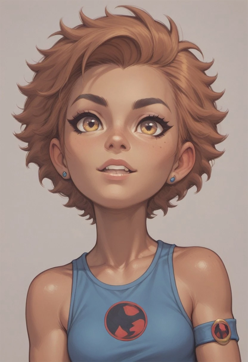 WilykitHQStyle, 1girl, solo, brown black stripe hair, blue tank top, multicolored skirt, one shoulder out, eye of thundera, utility belt, silver armlet