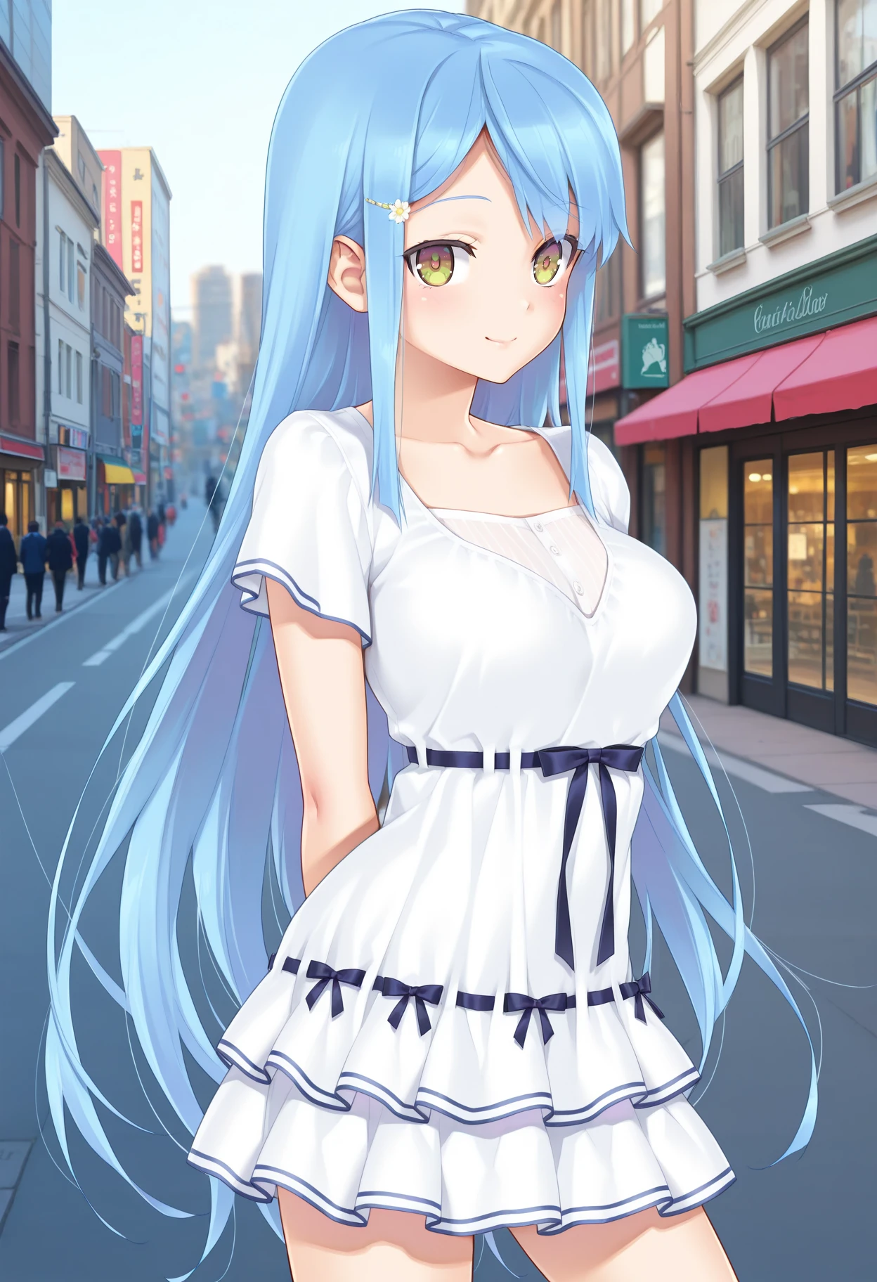 collarbone, medium dress, ribbon-trimmed dress, white dress, layered skirt, white skirt