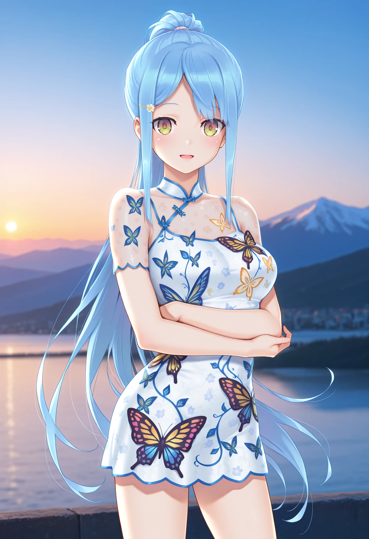 high ponytail, swept bangs, very long hair, light blue hair, multicolored eyes, brown eyes, green eyes, hairclip