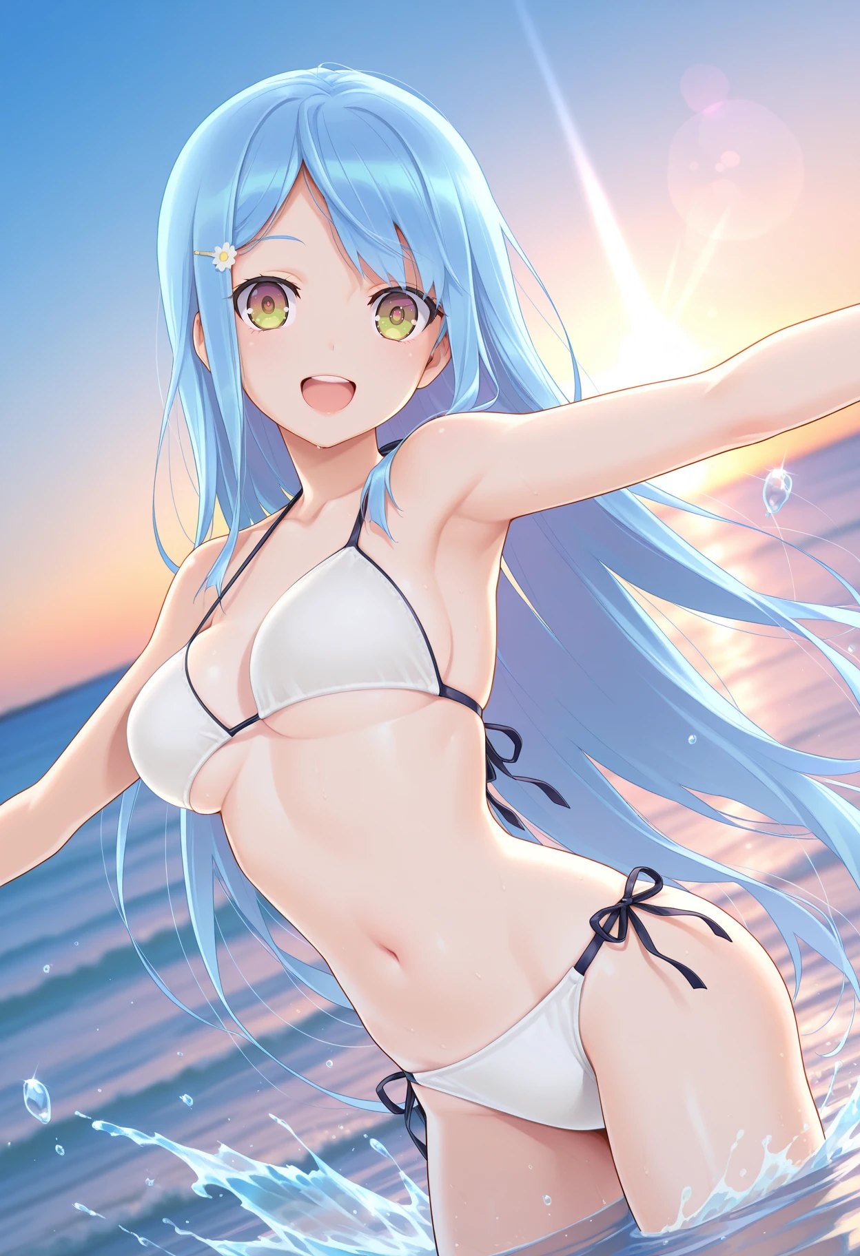 halterneck, medium breasts, white bikini, underboob, side-tie bikini bottom