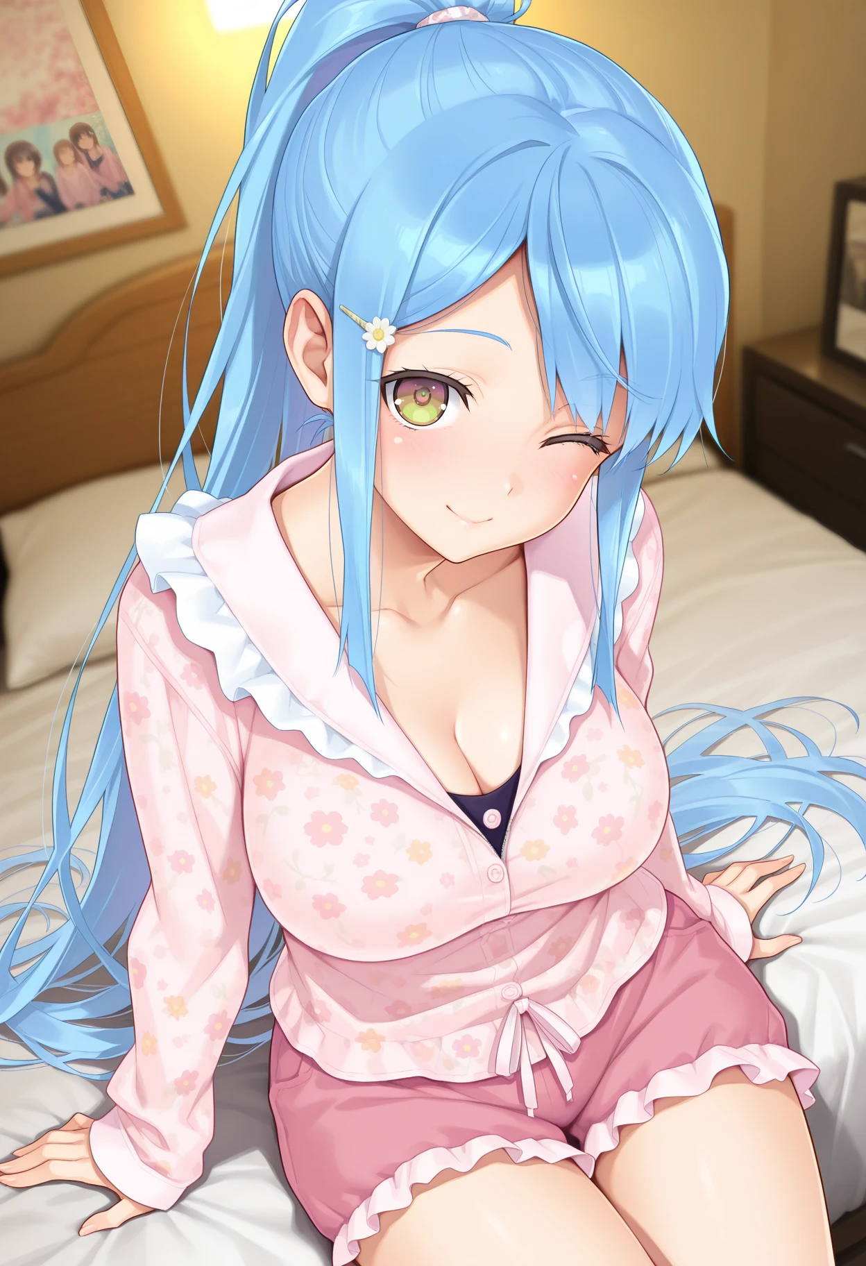 collarbone, light pink pajamas, floral print, cleavage, large breasts, frilled shorts, dark pink shorts