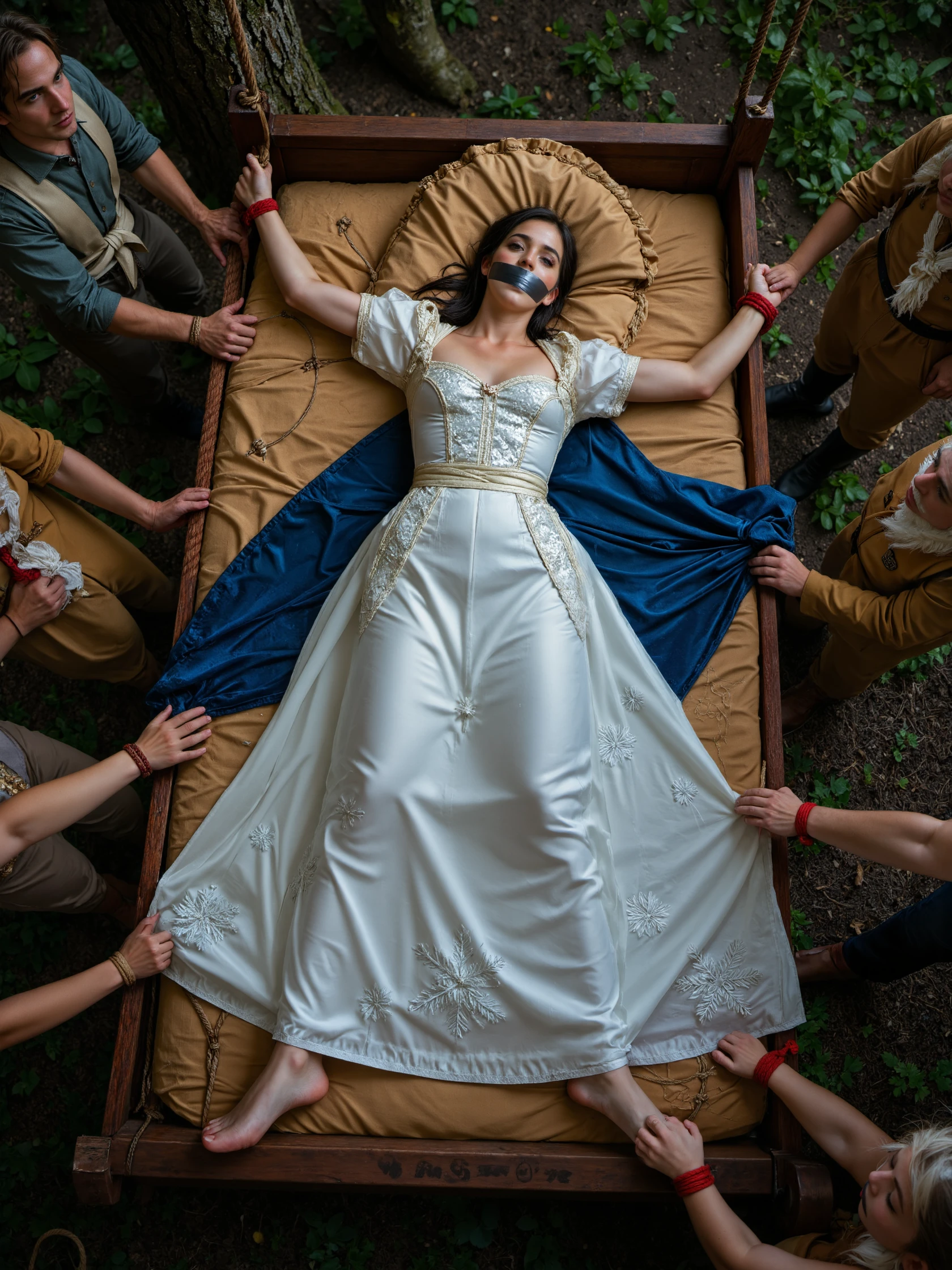 “The image is a high-resolution photograph of a ???? woman lying face down on a bed from behind. She is rope tied to the bed frame, her arms and legs are spread out. Her arms and legs are also in heavy bondage. She is blindfolded and her mouth is tape gagged, She is positioned on a neatly made bed with white sheets and pillows. The woman is between 21 and 30 years old, has a fair skin tone and shoulder-length blonde hair. She is positioned with her legs spread wide apart, revealing her bare buttocks and ??????, which is partially obscured by a bright pink ????? that is penetrating her ?????. Her body is slender and toned, with medium-sized breasts.