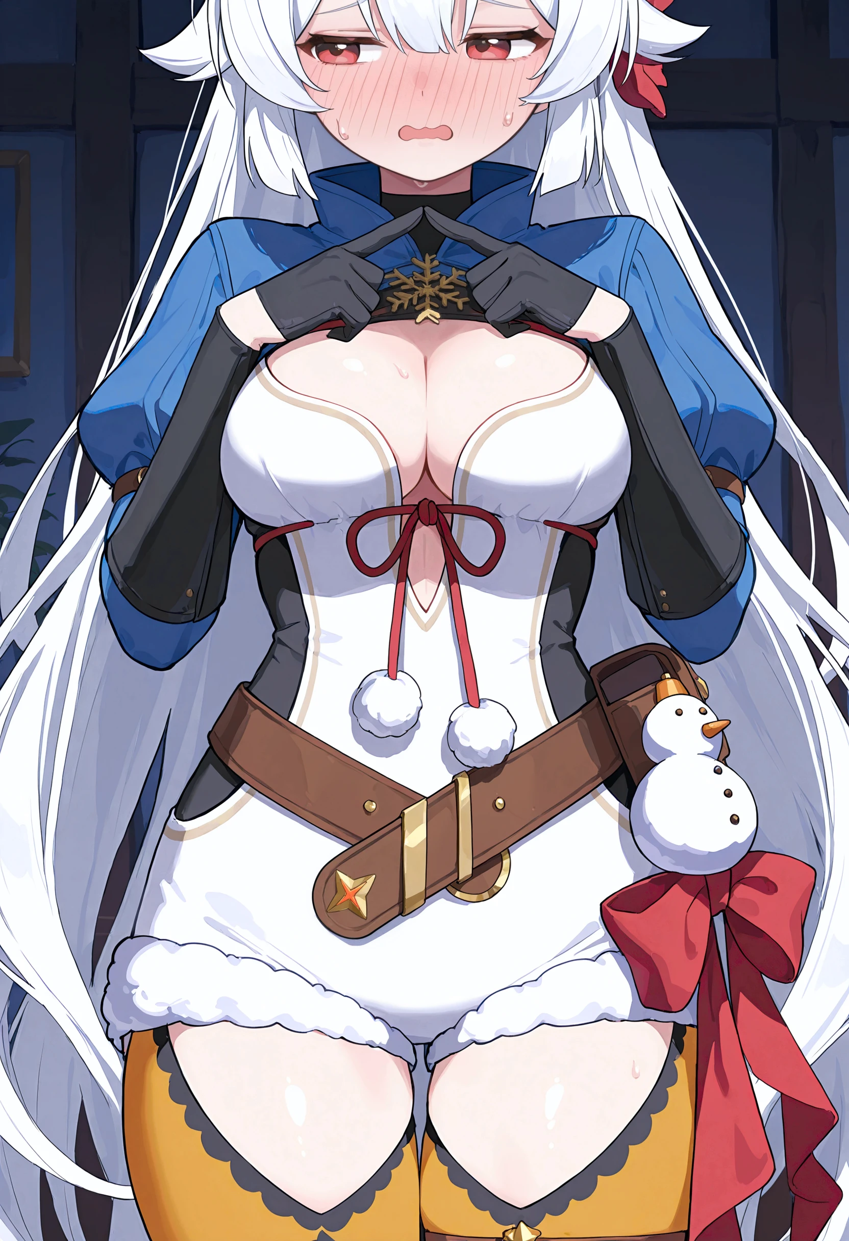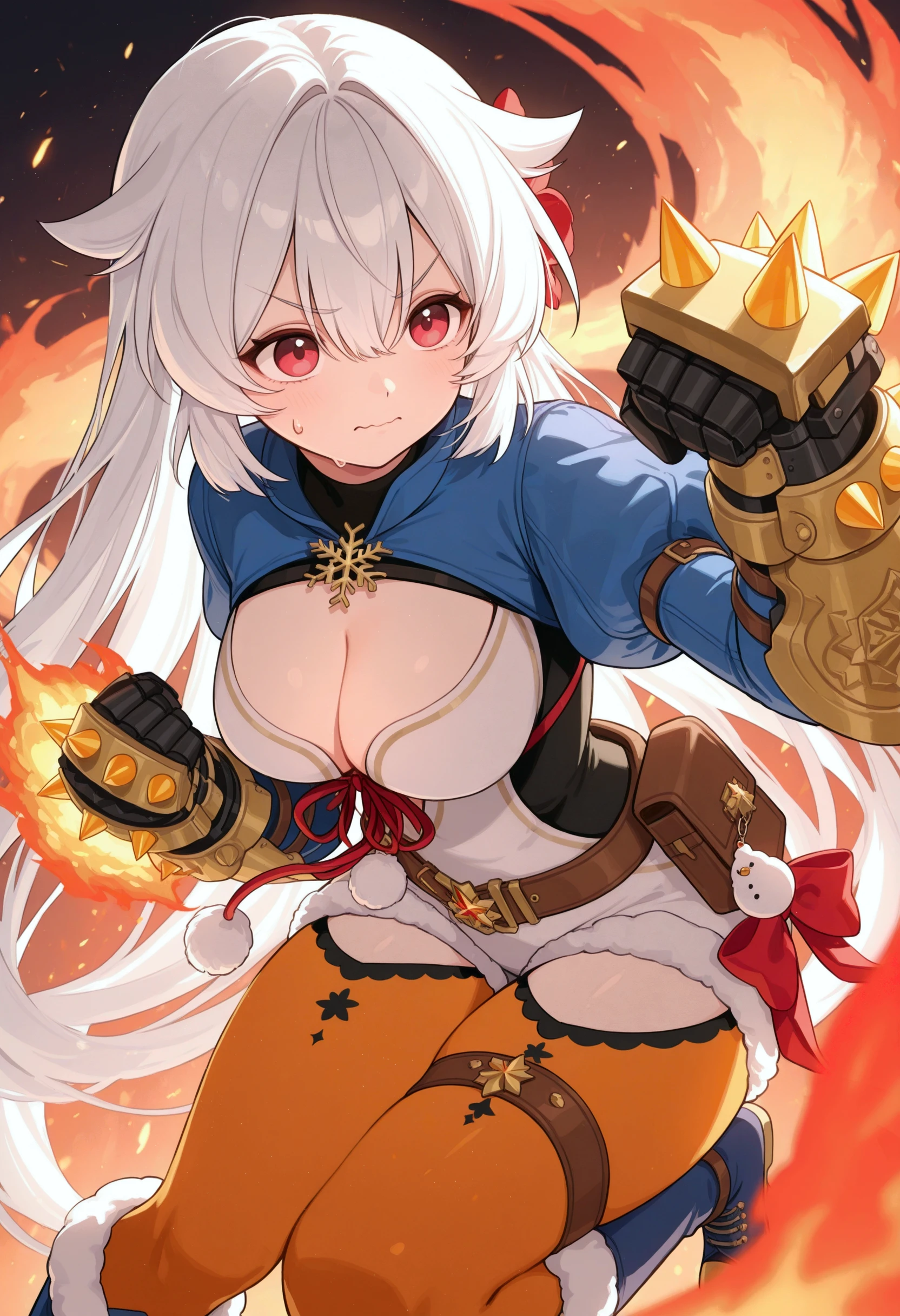 blue shrug (clothing), snowflake brooch, juliet sleeves, cleavage cutout, red ribbon, ????? ribbon, pom pom (clothes), white dress, black ????????, side cutout, black gloves, half gloves, black wrist guards, brown belt, belt pouch, star belt ornament, bag charm, red bow, white shorts, short shorts, fur-trimmed shorts, orange leggings, lace-trimmed leggings, thigh cutout, brown thigh strap, ankle boots, two-tone boots, blue boots, fur-trimmed boots,Additional tags / Accesories