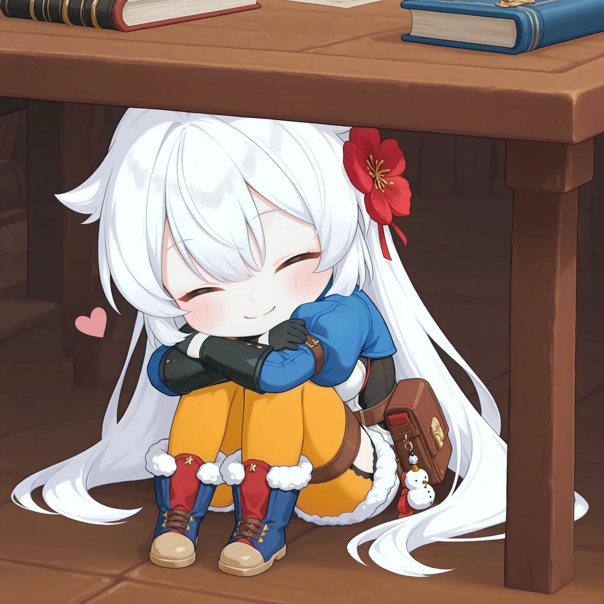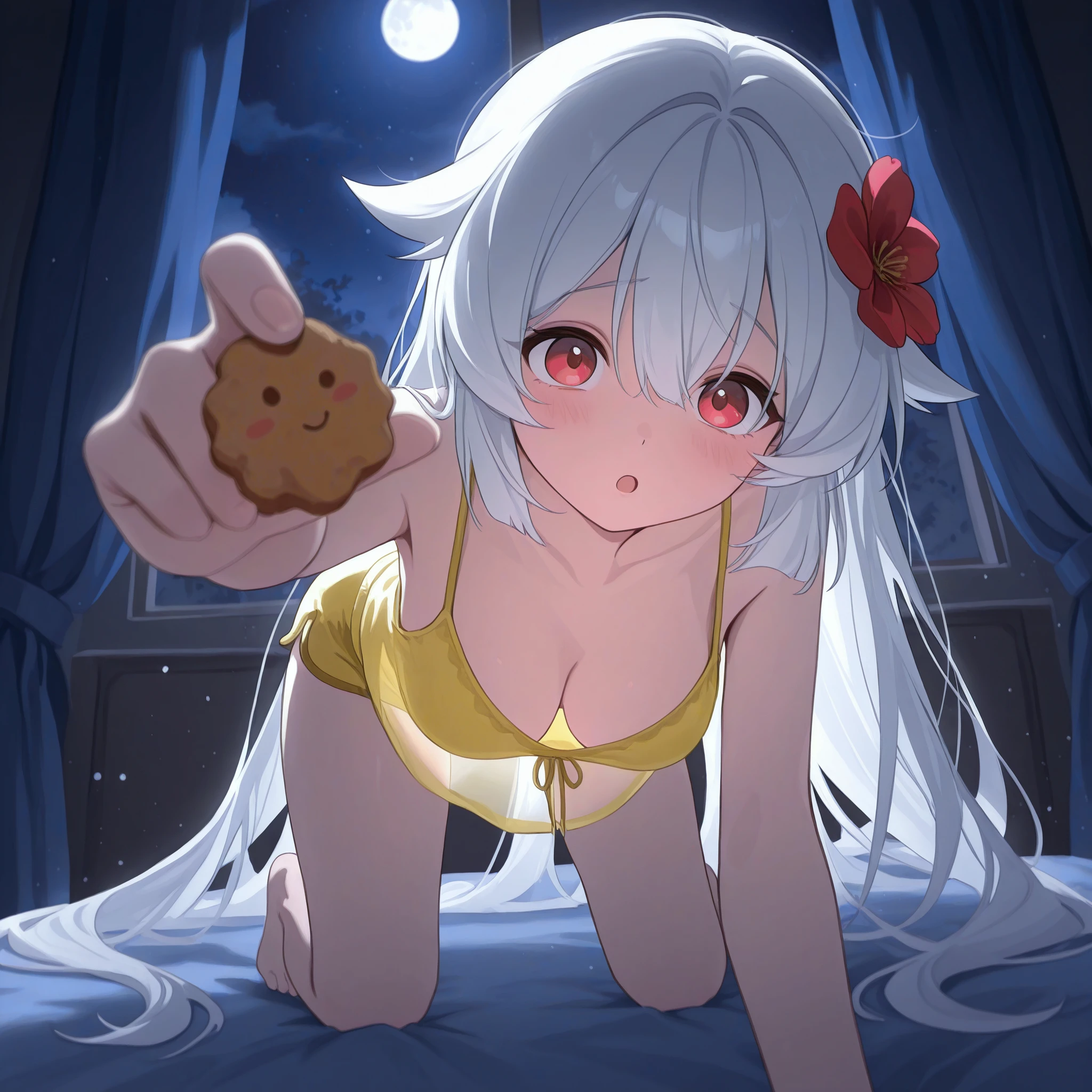 stell4fuyuk4, white hair, hair flaps, red eyes, hair flower, hair between eyes, long hair, red flower, medium breasts,Character Outfit