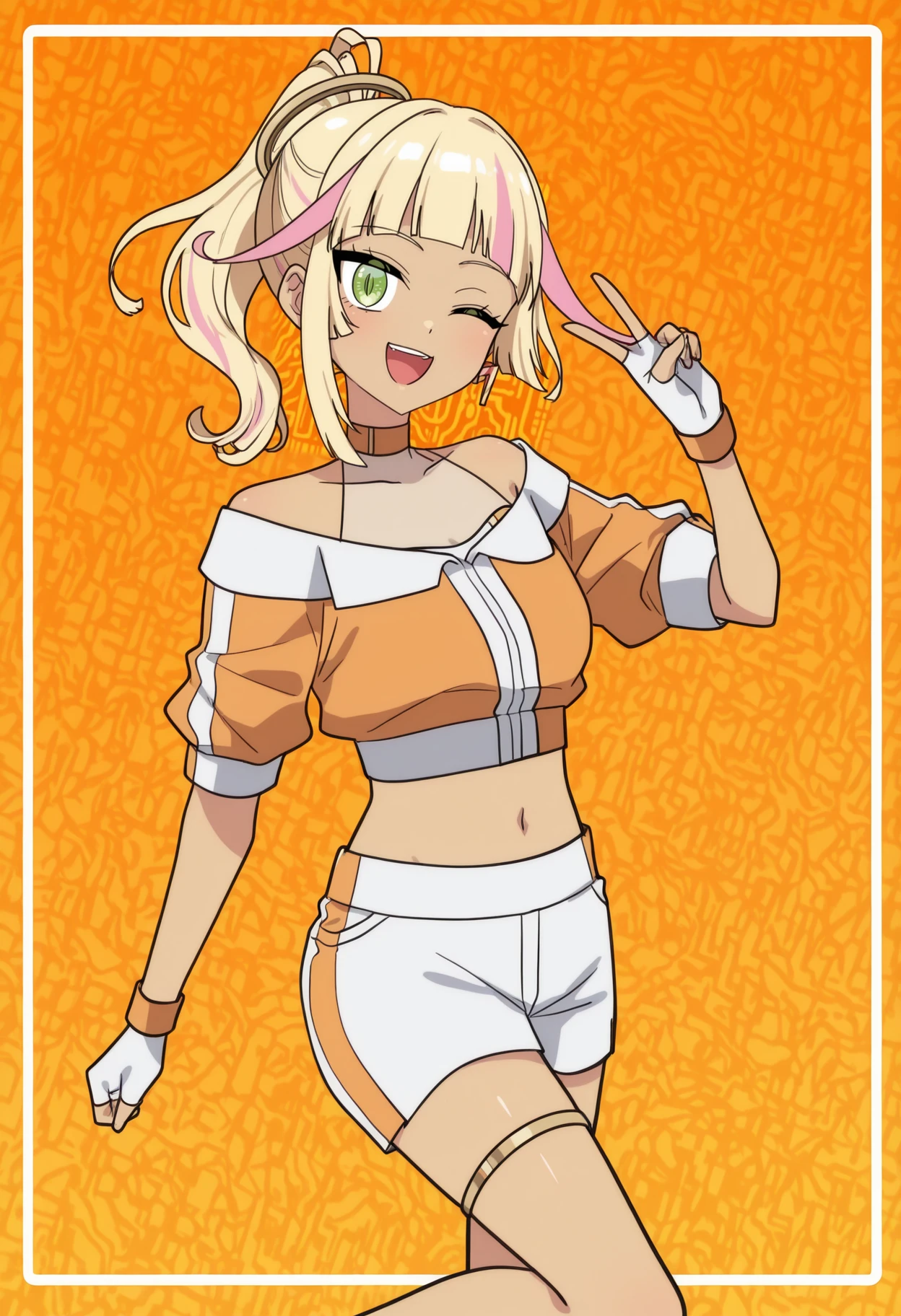 earrings, jewelry, choker, orange shirt, crop top, short sleeves, fingerless white gloves, shorts, thigh ring, bare shoulders, collarbone, midriff, navel, thighs,