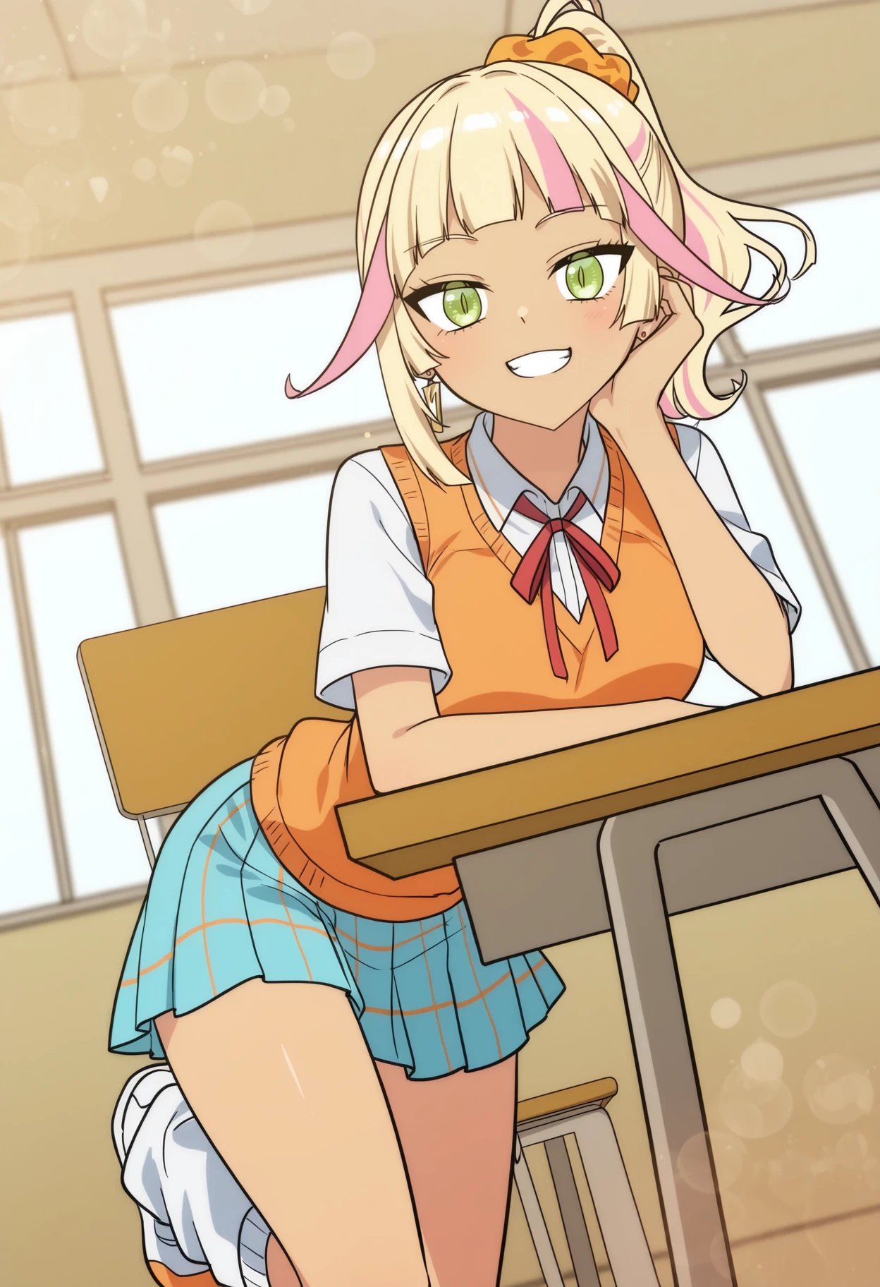 1girl, angel-no7(flag_chan!), green eyes, multicolored hair, blonde hair, pink streaked hair, ponytail, blunt bangs, sidelocks, dark skin,