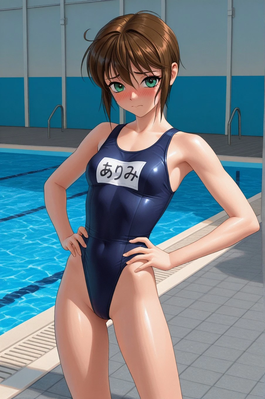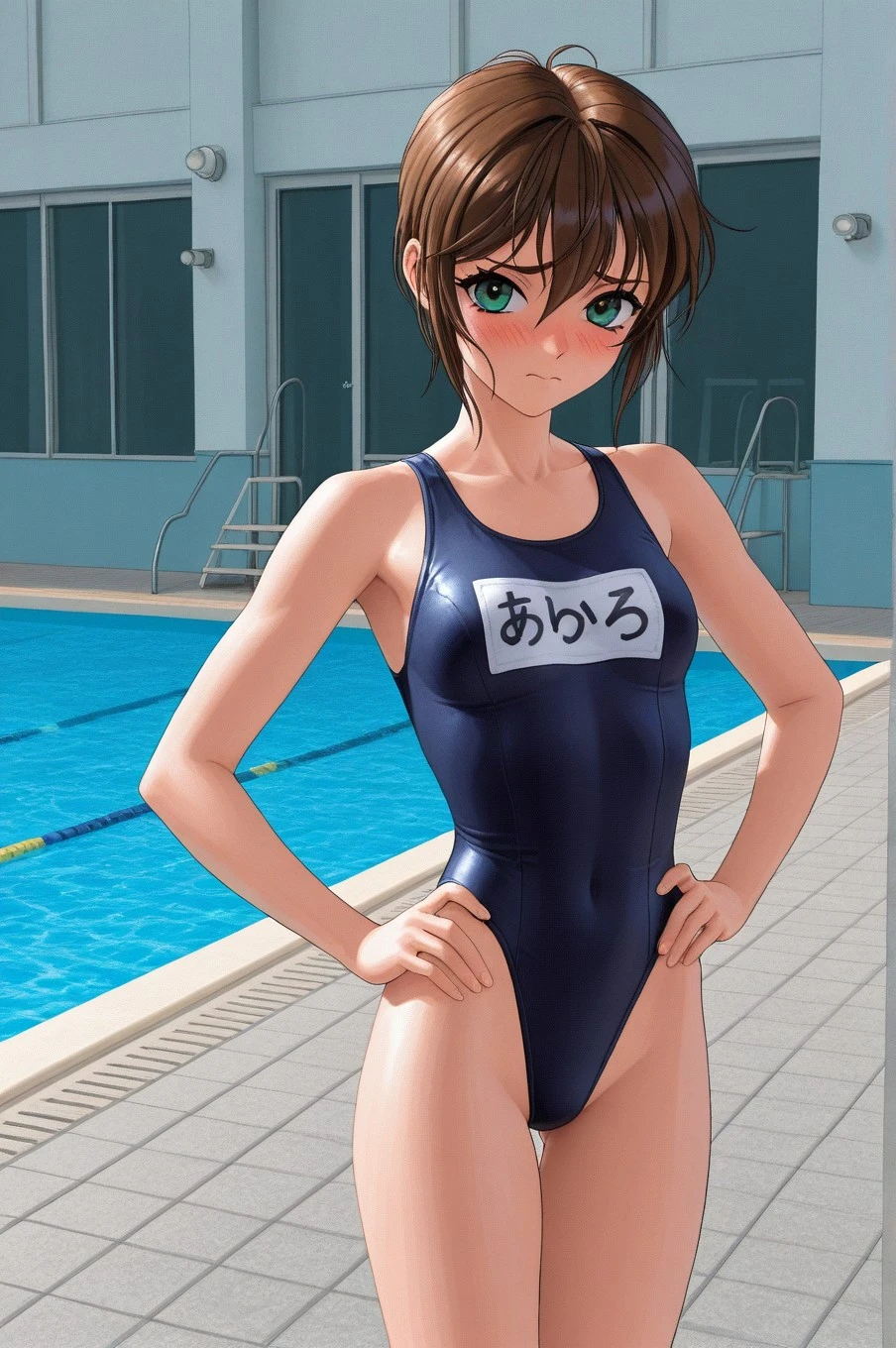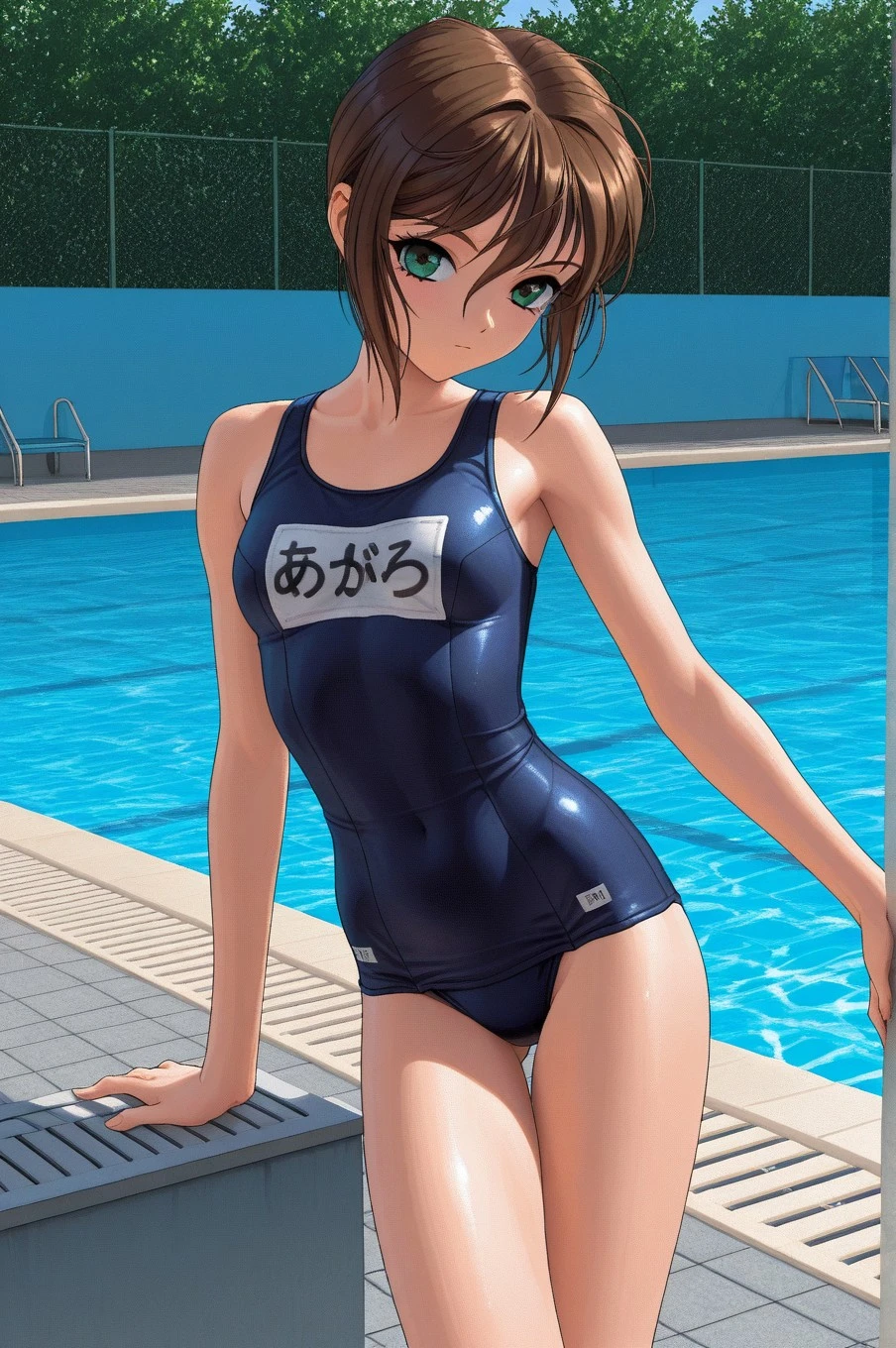 swimsuit, school swimsuit, one-piece swimsuit, name tag, barefoot,
