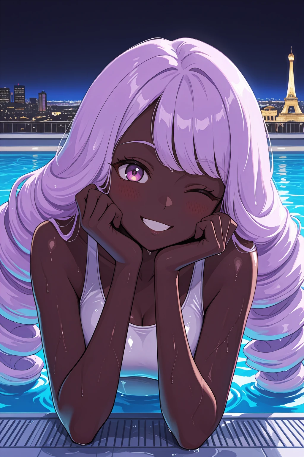 j4c1nth3, dark-skinned female, medium breasts purple eyes, purple hair, long hair, swept bangs, low drills