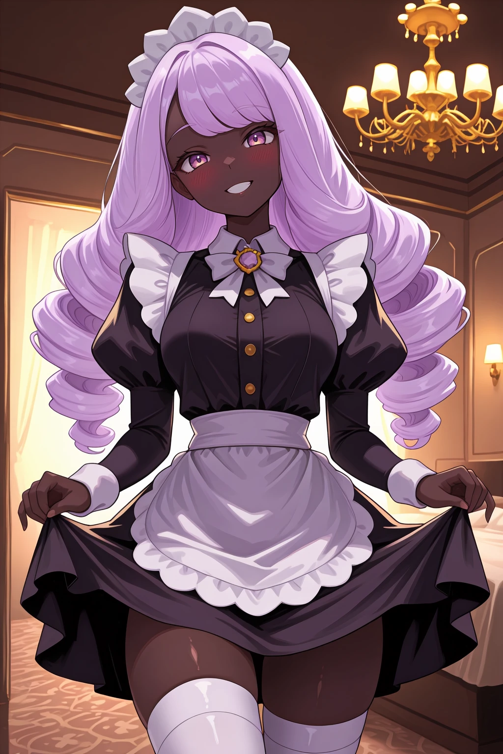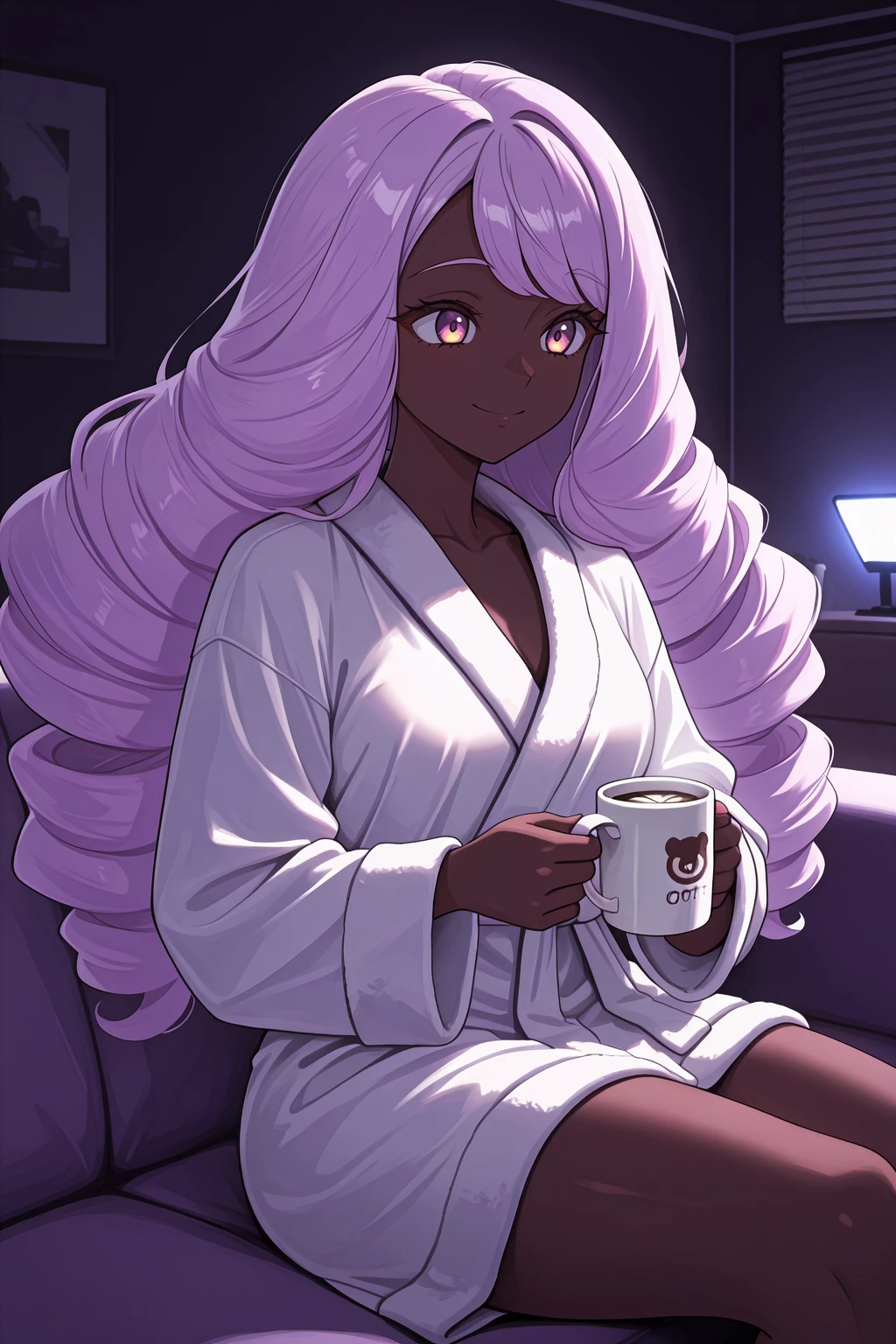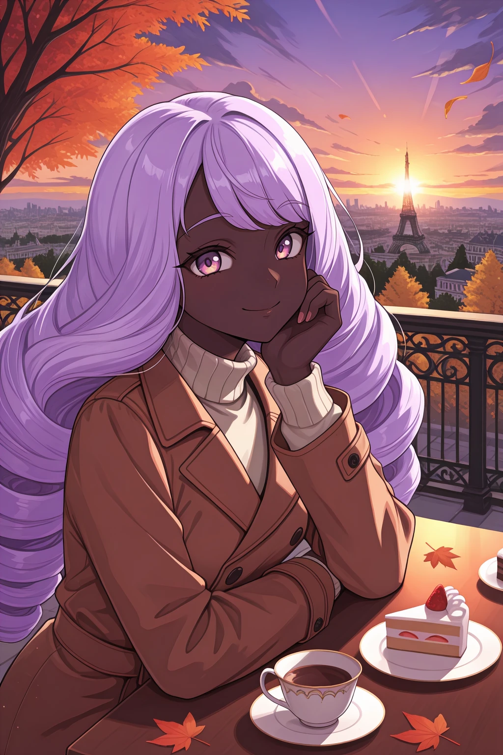 Appearance : j4c1nth3, dark-skinned female, ??????????????, purple eyes, purple hair, long hair, swept bangs, low drills