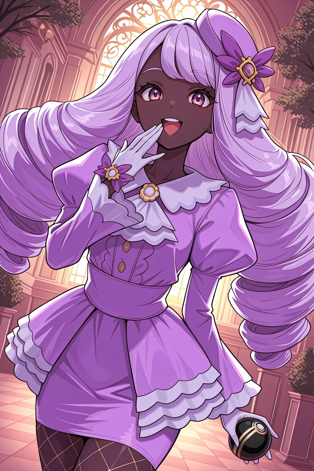 Outfit : purple hat, hat ornament, collared dress, purple dress, layered dress, pencil dress, frilled collar, frilled ascot, white ascot, center frills, juliet sleeves, long sleeves, frilled sleeves, white gloves, glove bow, fishnet pantyhose, purple shoes, high heels