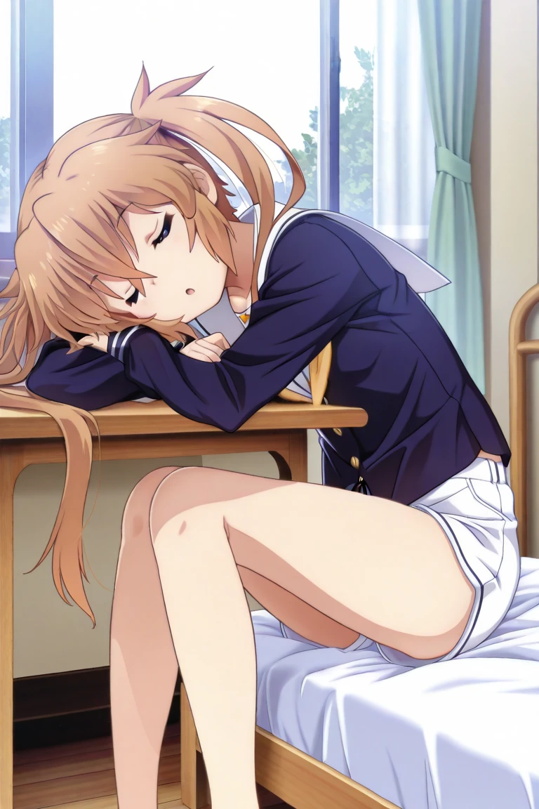 serafuku, white sailor collar, long sleeves, short shorts, white shorts, white socks, sneakers,