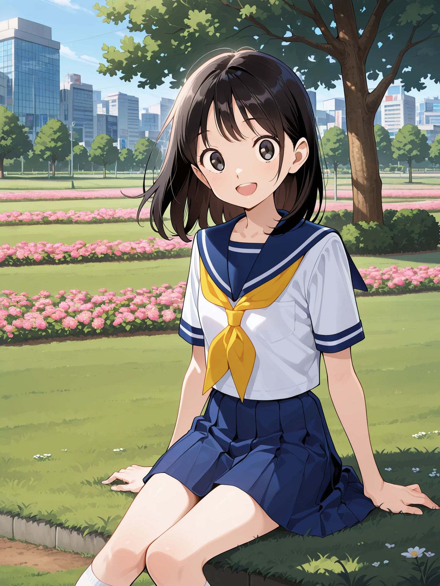 Prompts:watasemayumi, black hair, medium hairwhite shirt, blue sailor collar, yellow neckerchief, blue skirt